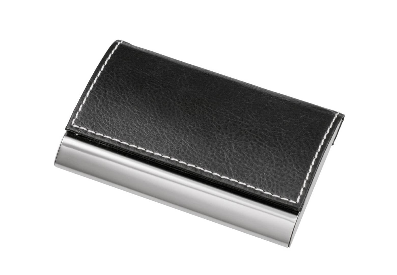Vizitkář PIET: vnitřek má sametovou podšívkou s cílem ochrany vizitek, leštěná povrchová úprava s koženým vzhledem s bílým prošíváním, magnetický uzávěr