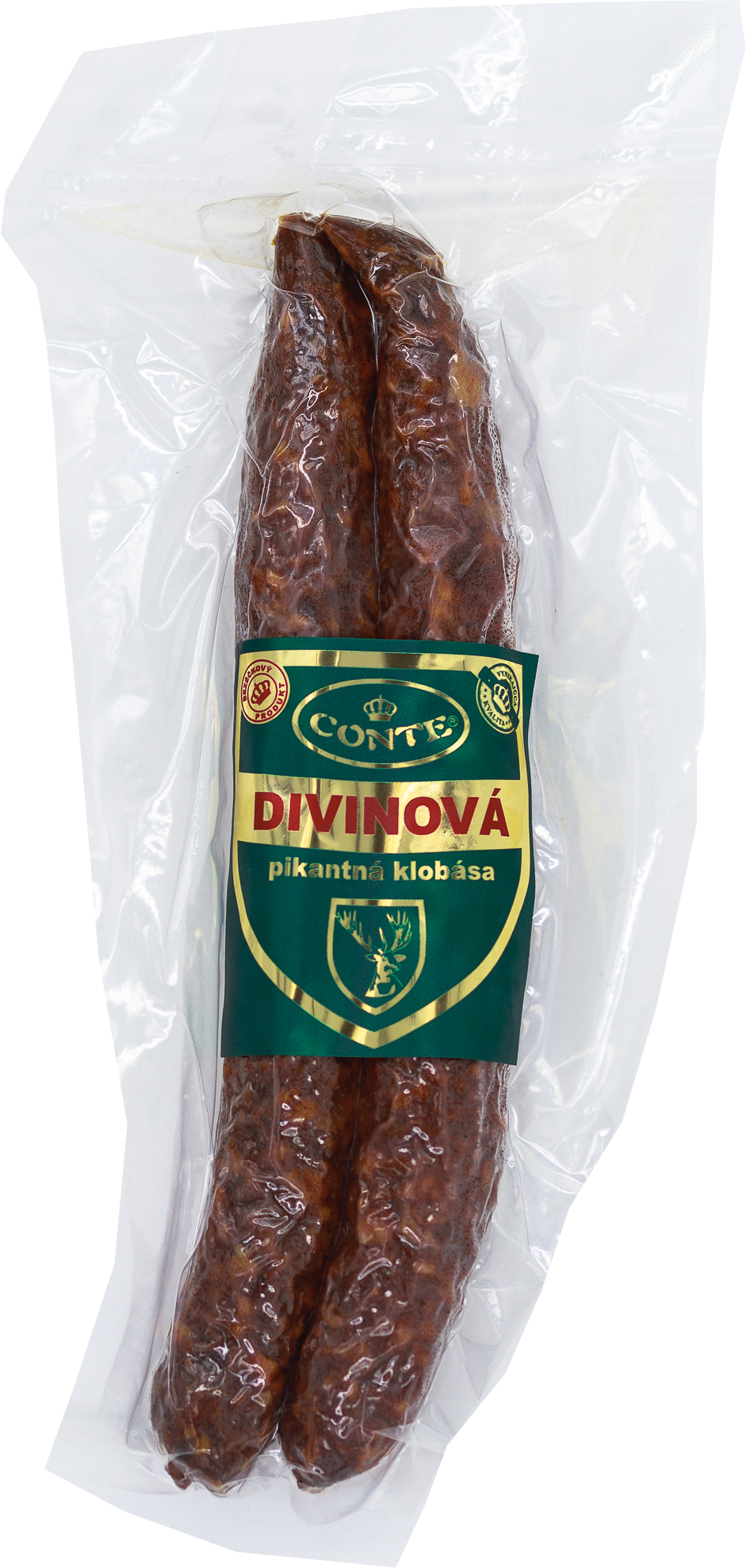 Pikantní klobása z divočáka - pikantní pochoutka z 51 % divočáka, 26 % hovězího a 20 % vepřového masa, ochucená česnekem, zázvorem a přírodním kořením, bez éček, vakuově balená. Pravá chuť slovenských luk se špetkou pikantnosti.
