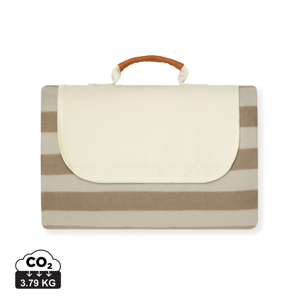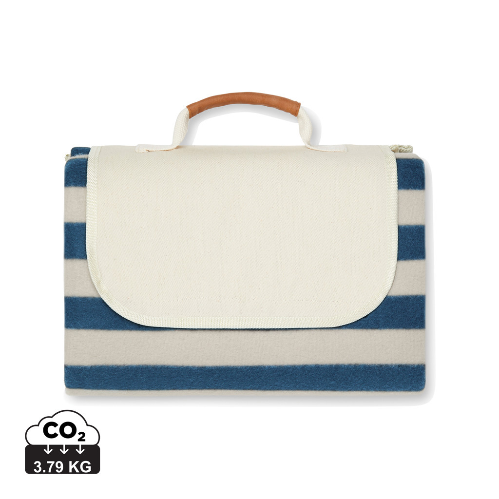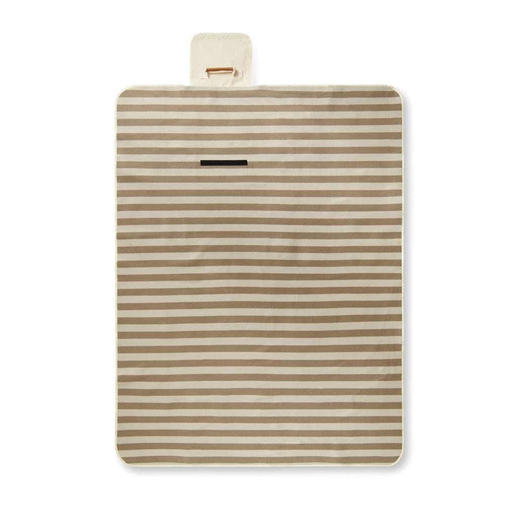 Pikniková deka z měkkého fleecu s detaily z bavlněného canvas a umělé kůže. Fleece je vyroben ze 100 % GRS certifikovaného RPET. GRS (Global Recycle Standard) je globální standard, který umožňuje ověřit použití recyklovaného materiálu v produktu napříč celým dodavatelským řetězcem. Celkový podíl recyklátu dle váhy produktu: 56 %. Spodní část vyrobena z vodu odpuzujícího materiálu PEVA. Chytrá konstrukce pro snadné složení.