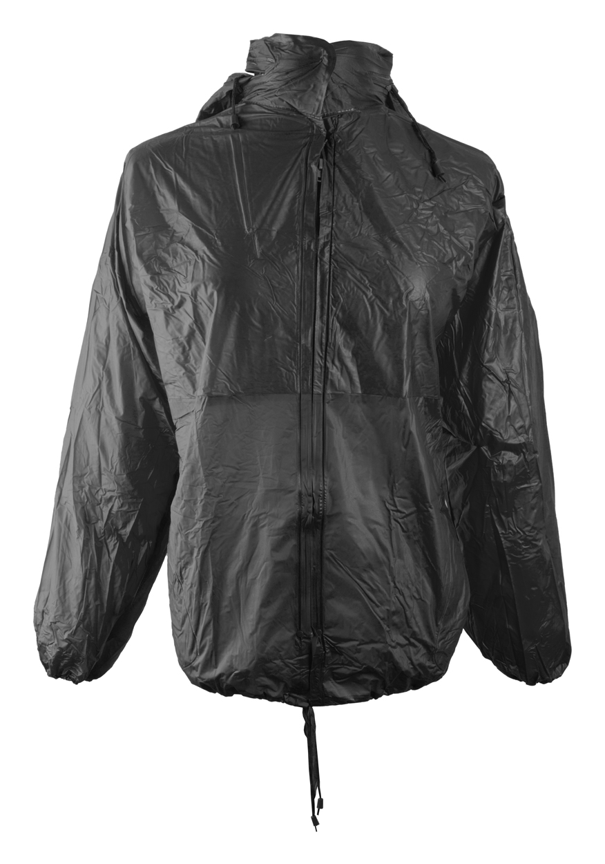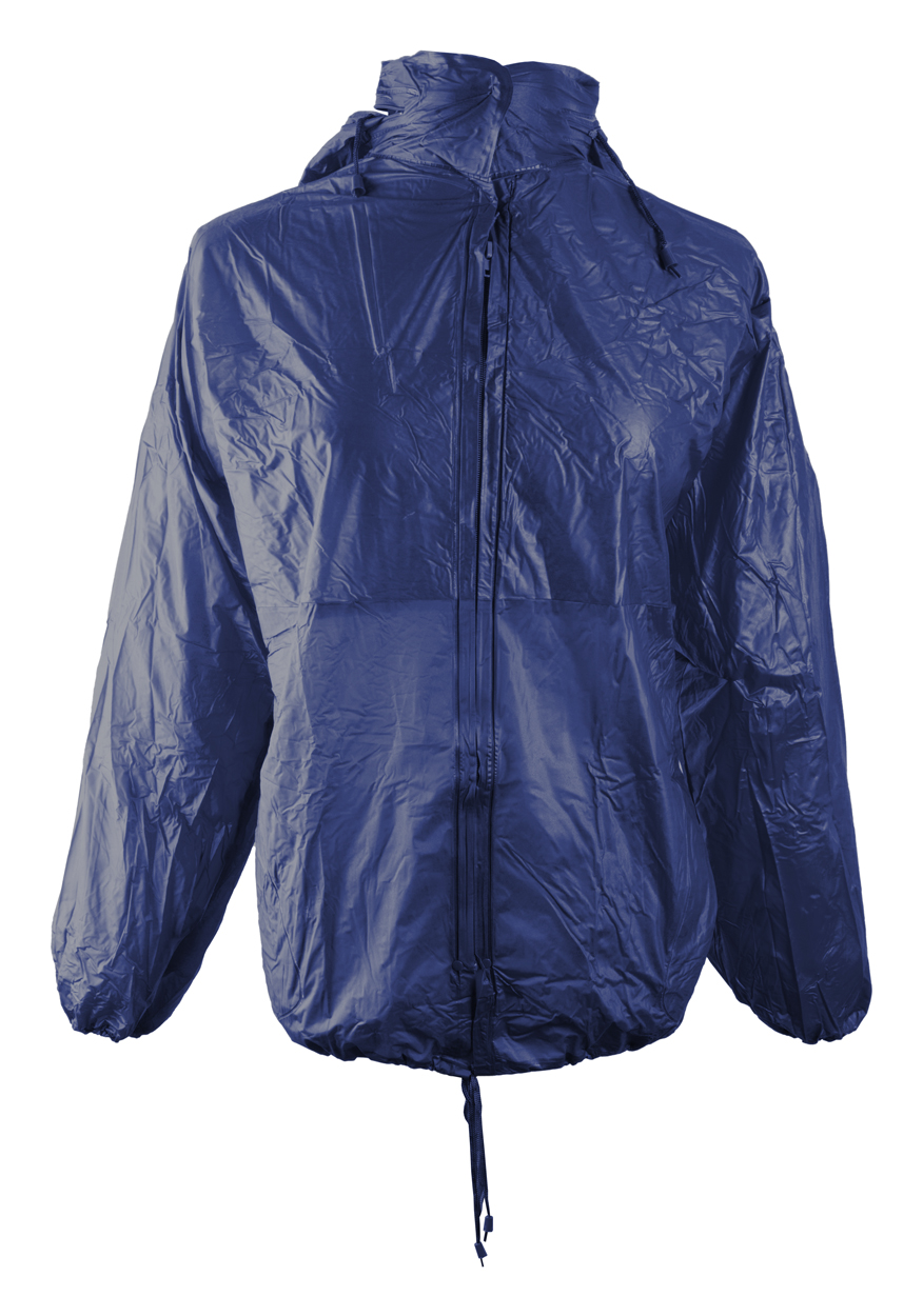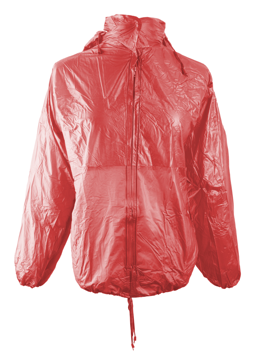 Pláštěnka se zipem po celé délce, elastickými manžetami, se 2 předními kapsami a se skrytou kapucí. Možnost složit do malé taštičky a připnout páskem kolem pasu. Materiál: PVC.
