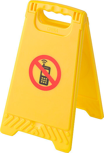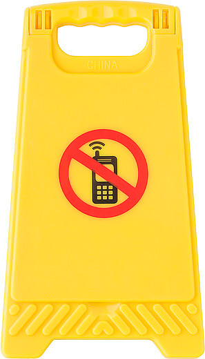 Plastová výstražná značka „žádné mobilní telefony“ se zrcadlem.