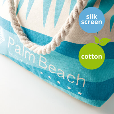 Plážová taška na míru z plátna s provazovou rukojetí. Bavlněná podšívka, vnitřní kapsa a zapínání na zip. Tašku lze plnobarevně celoplošně potisknout. Rozměry tašky jsou 40 x 32 cm; dno má 28 x14 cm a rukojeti: 70 x 1,5 cm (průměr). Dostupná i ve větší velikosti 48x38cm. Taška může mít i dodatečné zavírání na stiskací knoflík za příplatek.