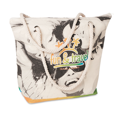 Plážová taška na míru z plátna s provazovou rukojetí. Bavlněná podšívka, vnitřní kapsa a zapínání na zip. Rozměry: 48(š) x 38(v); dno 34(š)x17(h)cm. Rukojeti: 70 x 1,5 cm průměr. Upozorňujeme, že není možné kombinovat sítotisk a digitálně vytištěné vzory. Materiál: 280 g/m² bavlna (plátno). Dodatečné zavírání na zip / kovový knoflík za příplatek.