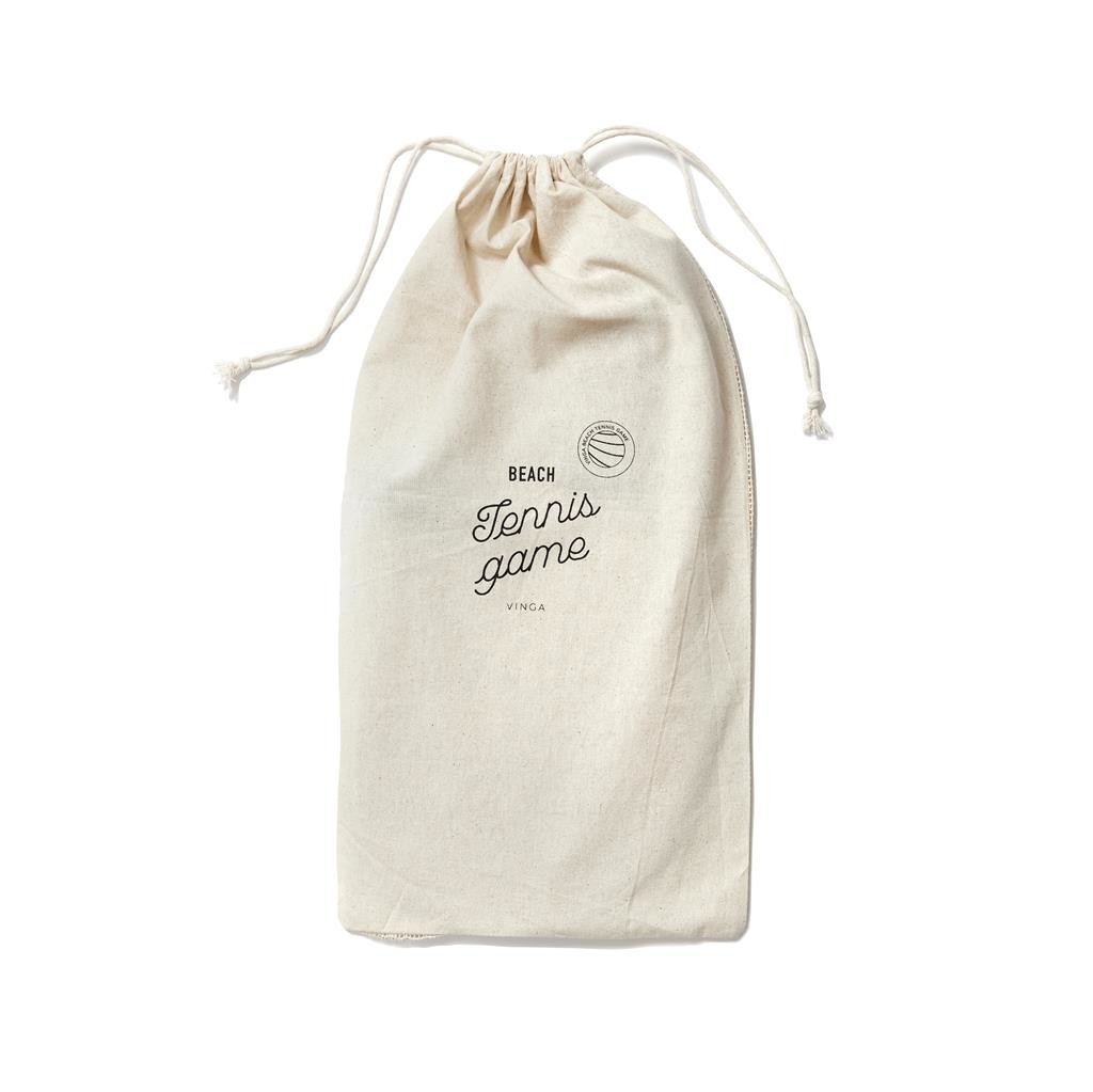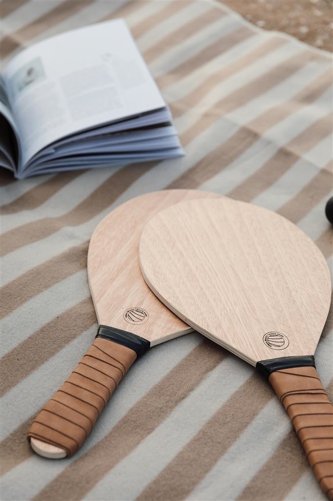 Elegantní sada na plážový tenis vyrobená z topolového dřeva s rukojeťmi z veganské kůže pro pohodlnější úchop. Hra, která se snadno učí a je vhodná pro malé i velké. Obsahuje dvě rakety a dva gumové míčky, zabalené v plátěné tašce, díky které je můžete snadno přenášet s sebou.
