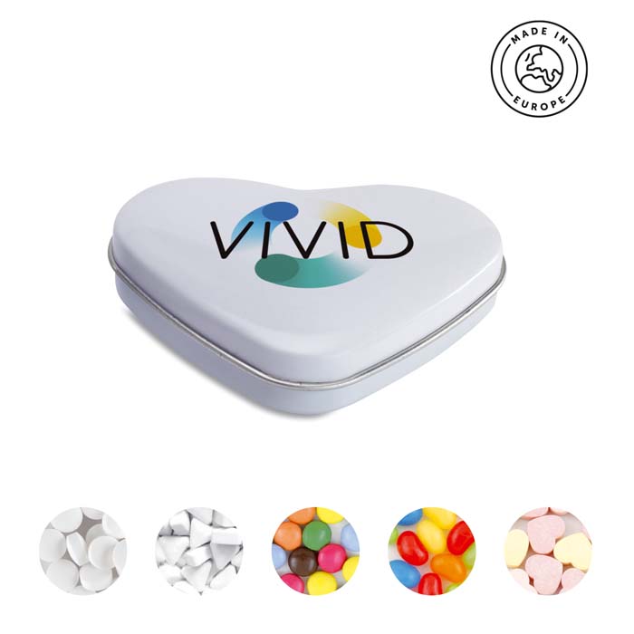 Vyrobeno v Evropě: Srdeční plechová nádoba. Velikost: 70x65x15 mm.
