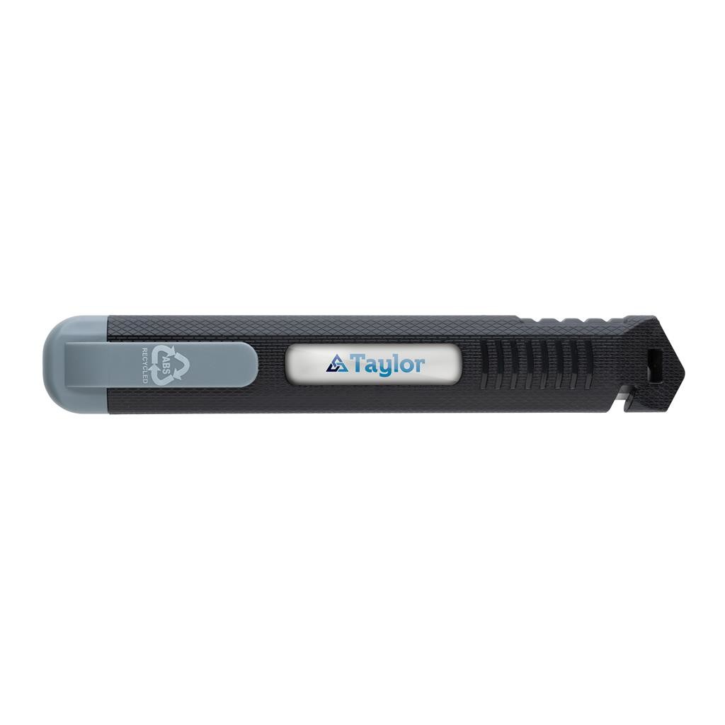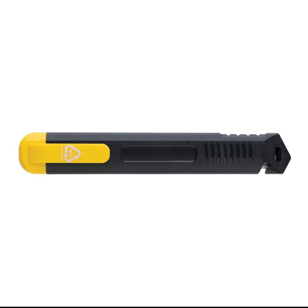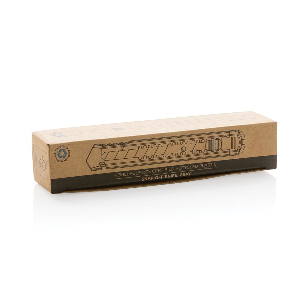 Opakovaně plnitelný nůž s odlamovací čepelí. Obal vyrobený z RCS recyklovaného ABS, čepel z SK4 nerezavějící oceli. RCS (Recycled Claim Standard) je globální standard, který umožňuje ověřit použití recyklovaného materiálu v produktu napříč celým dodavatelským řetězcem. Celkový podíl recyklátu dle váhy produktu: 78 %. Čepel lze po ztupení jednoduše o díl zalomit a získat tím opět ostrou část. Po využítí celé čepele ji lze jednoduše vyměnit a nahradit novou. Balení obsahuje 1 nasazenou a 2 náhradní čepele. Baleno v FSC® kraftové dárkové krabičce.