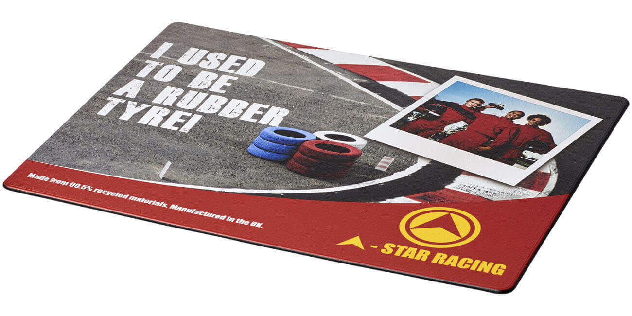 Podložka pod myš Brite-Mat® s materiálem z recyklovaných pneumatik. Podložka pod myš navržená pro práci se standardními kuličkovými a optickými myšmi. Vyrobeno z 99,5 % z recyklovaných materiálů, včetně 40 % recyklovaného materiálu z pneumatik a navíc z recyklovaných plastů a papíru. Laminovaný papír, recyklované plasty a materiál z recyklovaných pneumatik.