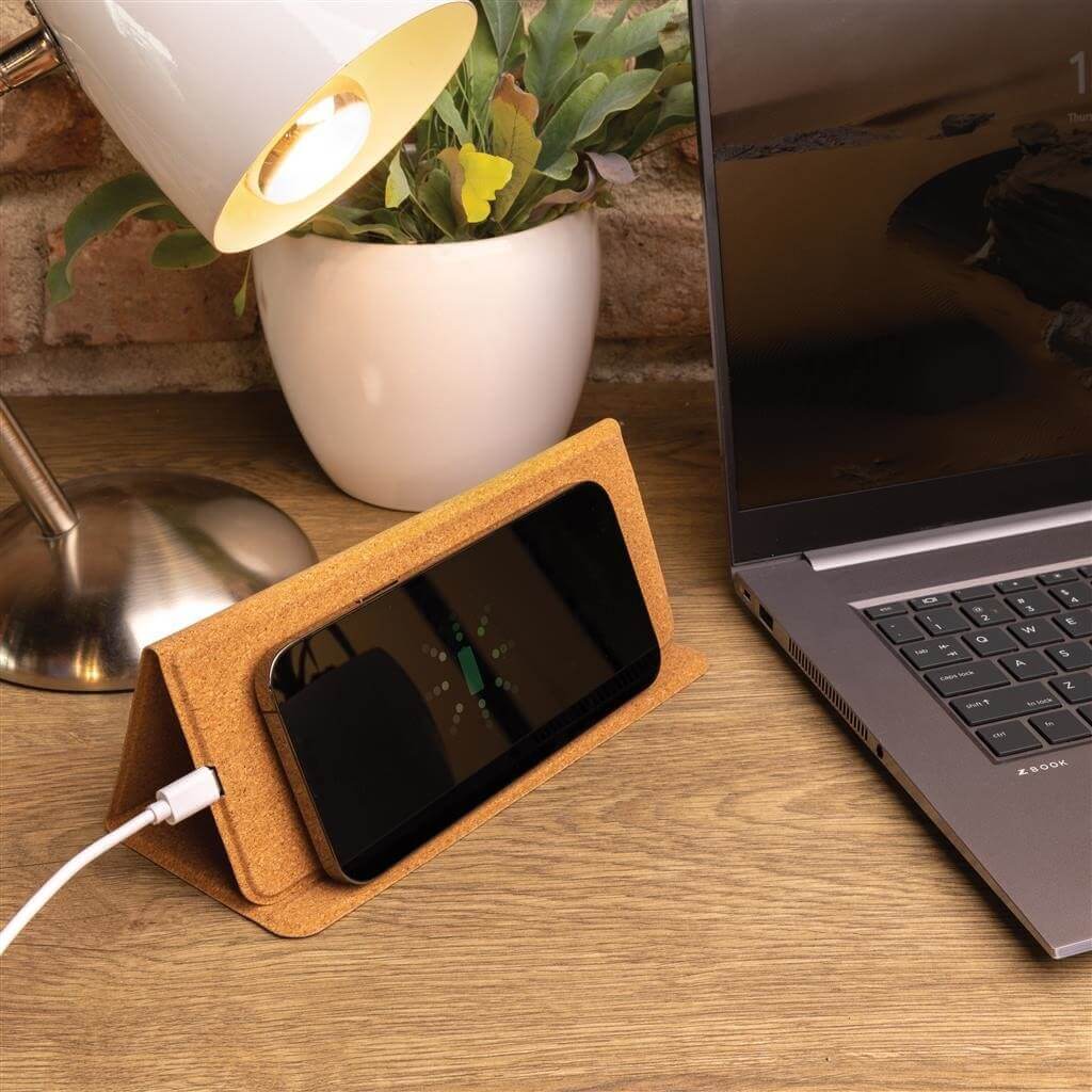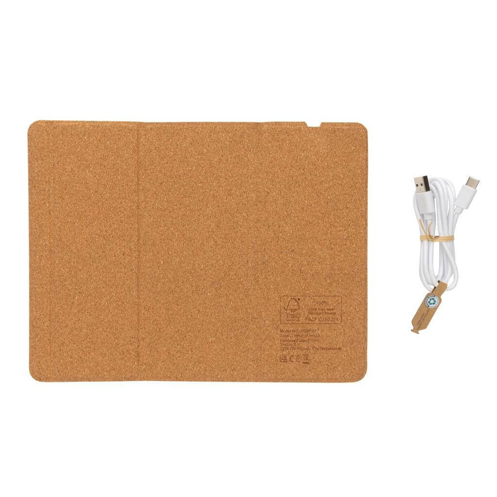 Podložka pod myš s rychlým bezdrátovým nabíjením 10W. Umožňuje složení a použití jako stojánek na telefon. Vnější část vyrobená ze 100 % FSC® korku. Bezdrátové nabíjení je kompatibilní se všemi telefony podporujícími QI, jako jsou nejnovější generace Android, iPhone 8 a výše. Včetně 120cm USB C nabíjecího kabelu z RCS recyklovaného TPE. USB C vstup: 9V/2A. Bezdrátový výstup: 9V/1,1A (10W). Baleno v FSC kraftové dárkové krabičce.