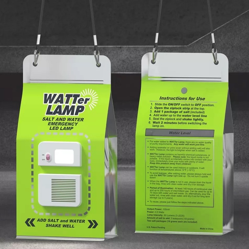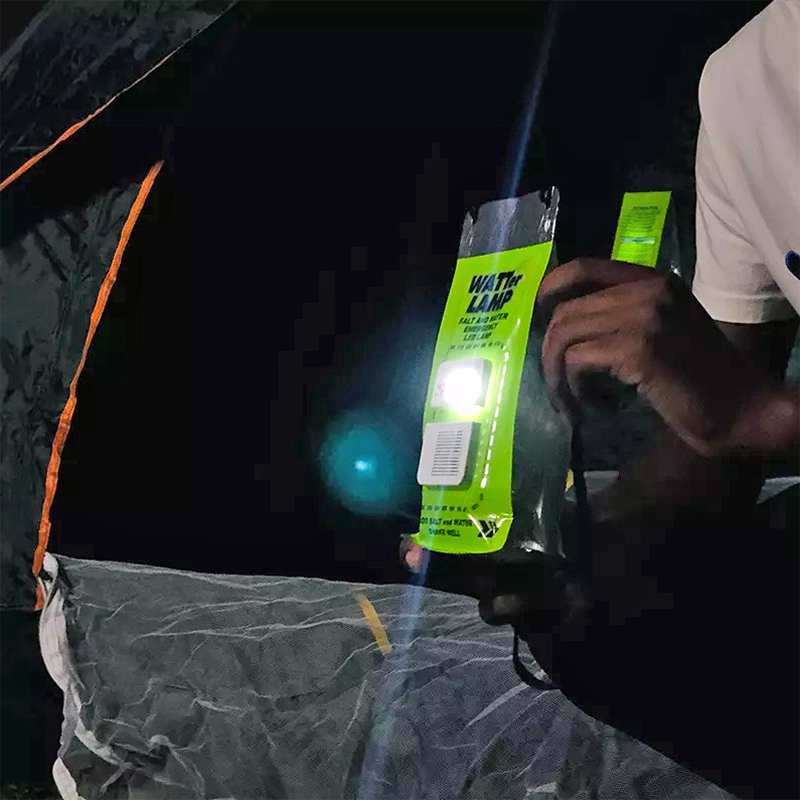 Unikátní pomůcka pro táboření, kempování a turistiku - elektrická lampa, která svítí a nepotřebuje ani baterii, ani připojení do elektrické sítě. Stačí jen naplnit vodou a přidat lžíci kuchyňské soli! Chemická baterie ve svítilně dokáže za pomoci slaného roztoku svítit několik desítek hodin. Slaný roztok je možno ze zásobníku vymýt a svítilnu tak používat opakovaně. K dispozici jsou v záklaním balení i dvě dávky soli, takže se nemusíte bát, že ji budete muset v přírodě shánět. Navíc baterie je schopná víceméně fungovat na jakýkoli roztok obsahující minerální soli, např. mořskou vodu, nebo v případě nejvyšší nouze můžete zásobník naplnit i vlastní močí - zkrátka lampa do extrémních podmínek! Lampa má závěs pro nošení na zavazadle, nebo si ji můžete pověsit na krk. Zásobník má dvojité těsnění, takže se nemusíte bát, že z něj bude při chůzi unikat voda nebo nějaký "aromatičtější" roztok.