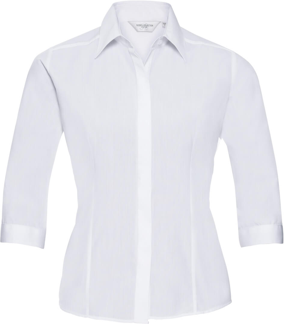 105g/m², 65% polyester, 35% bavlna dámská stylová popelínová košile s 3/4 rukávem, má dekorativní záševky na prsou a zádech, zaoblený spodní lem a skrytou légu, na rukávech jsou úzké nastavitelné manžety s knoflíčky, lze prát na 50°