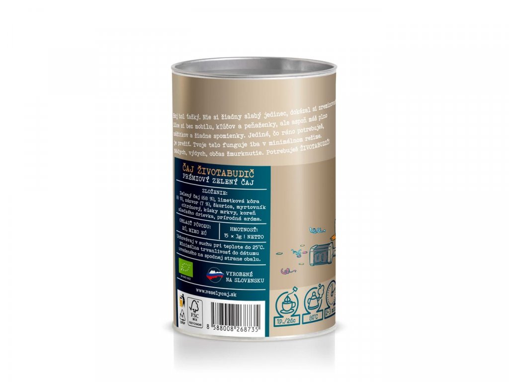 Života Budič je silná směs BIO zeleného čaje pro rychlé probuzení po náročném dni či noci. Obsahuje zelený čaj (68%), limetkovou kůru (8%), zázvor (7%), skořici, myrtovník citrónový, kousky mrkve, kořen lékořice, přírodní aroma. Příprava: 1 pyramidka na 2dcl, voda 80°C, louhovat 2–3min. Hmotnost: 60g. Všechny složky v BIO kvalitě. Váha: 60 g (15 pyramidek)