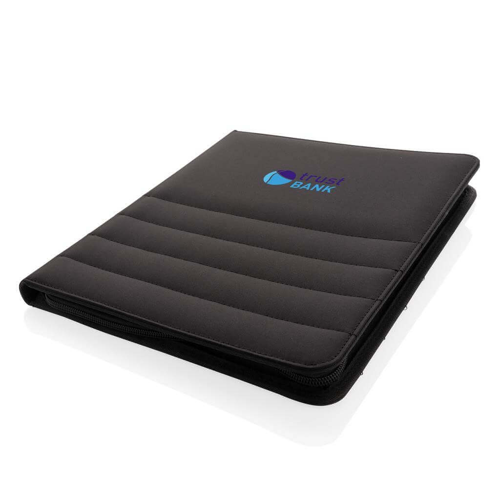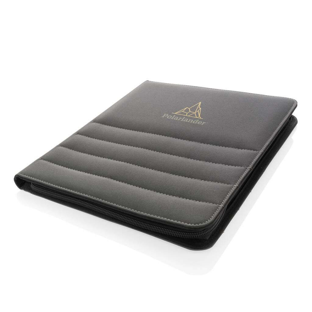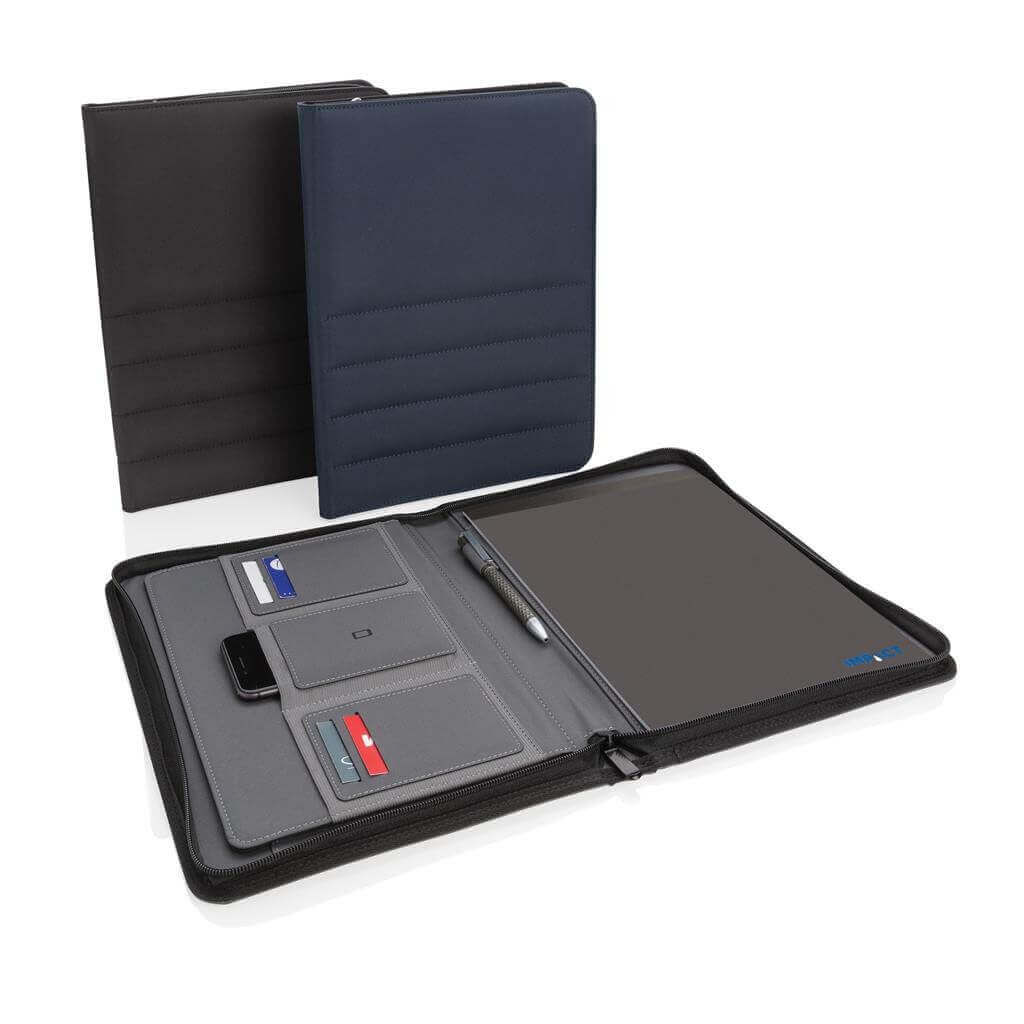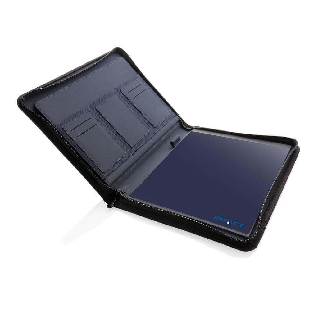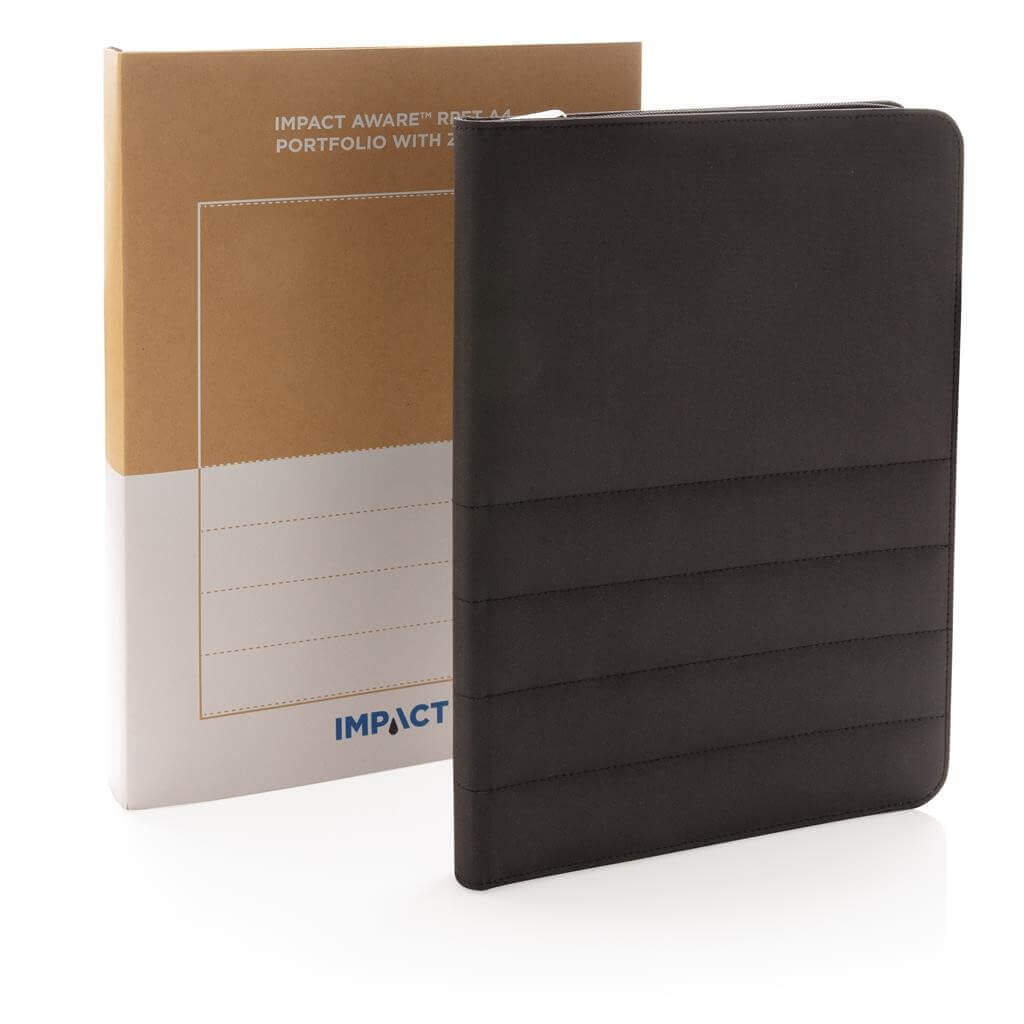 Unikátní portfolio se zipem ve formátu A4 vyrobené z RPET AWARE™. Uvnitř obsahuje 1 velkou kapsu, kapsu na telefon, 2 dodatečné menší kapsy, 4 sloty na karty a poutko na pero. Včetně poznámkového bloku s 20 listy/40 stranami recyklovaného krémového linkového papíru o gramáži 80g/m2. Vnější tkanina a vnitřní podšívka je vyrobena ze 100 % polyesteru AWARE™ získaného z recyklovaných PET lahví. AWARE™ využívá skutečně recyklované materiály, které jsou použitím speciální technologie dohledatelné od jejich zdroje. Recyklace má pozitivní vliv na životní prostředí a při výrobě šetří obrovské množství vody. Bez PVC.