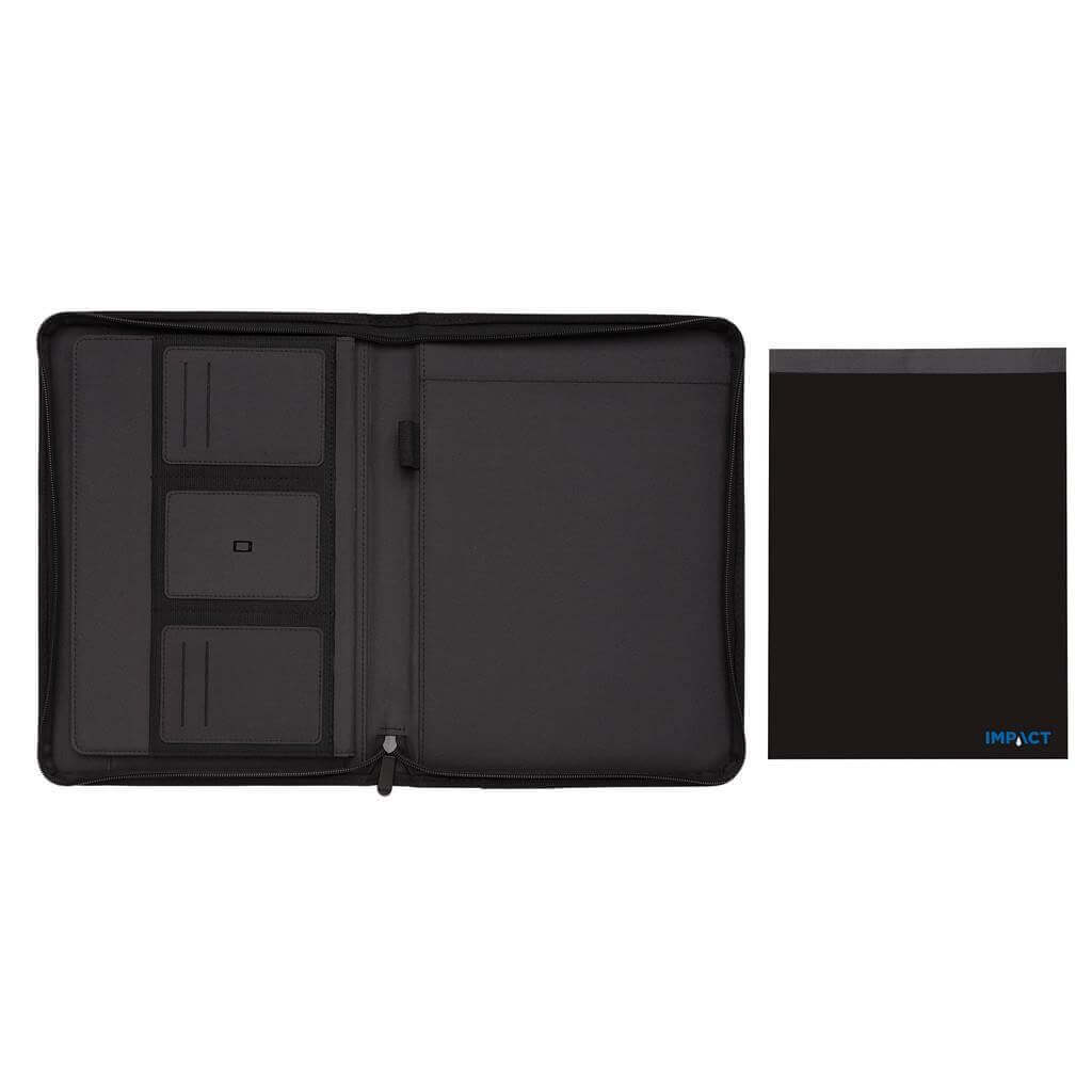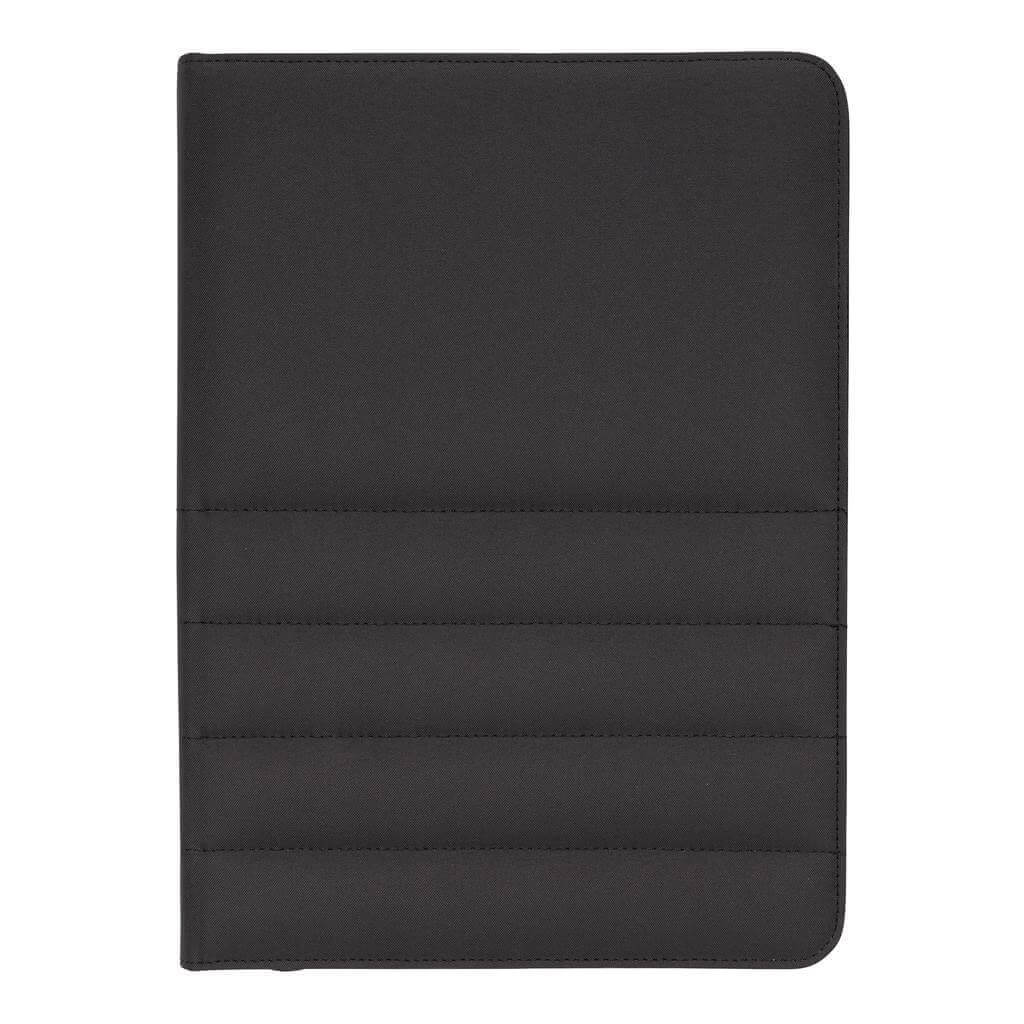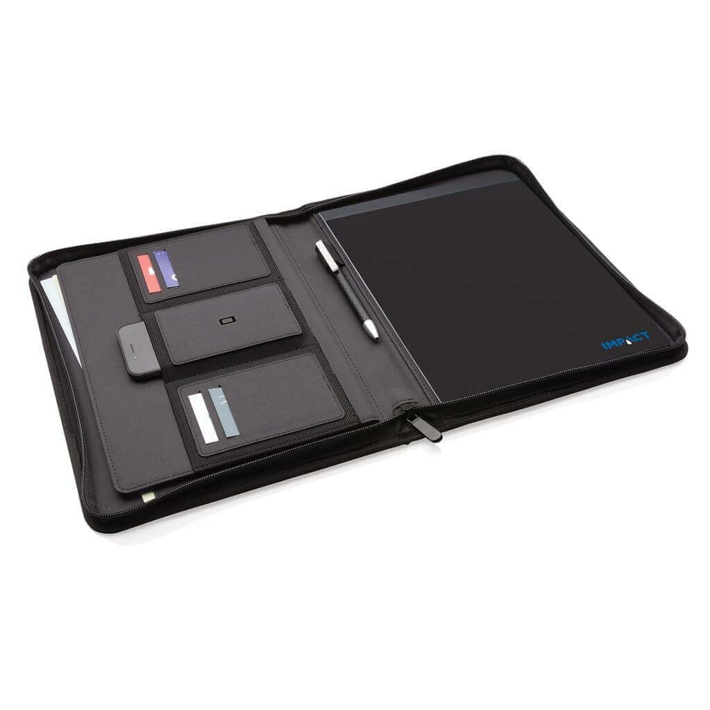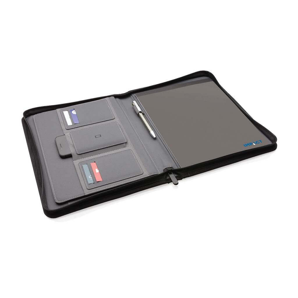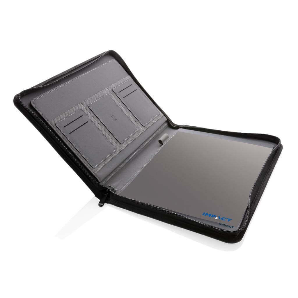 Unikátní portfolio se zipem ve formátu A4 vyrobené z RPET AWARE™. Uvnitř obsahuje 1 velkou kapsu, kapsu na telefon, 2 dodatečné menší kapsy, 4 sloty na karty a poutko na pero. Včetně poznámkového bloku s 20 listy/40 stranami recyklovaného krémového linkového papíru o gramáži 80g/m2. Vnější tkanina a vnitřní podšívka je vyrobena ze 100 % polyesteru AWARE™ získaného z recyklovaných PET lahví. AWARE™ využívá skutečně recyklované materiály, které jsou použitím speciální technologie dohledatelné od jejich zdroje. Recyklace má pozitivní vliv na životní prostředí a při výrobě šetří obrovské množství vody. Bez PVC.