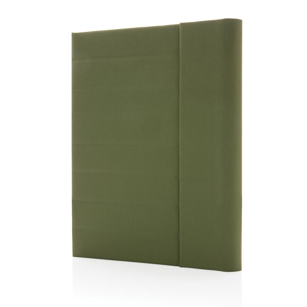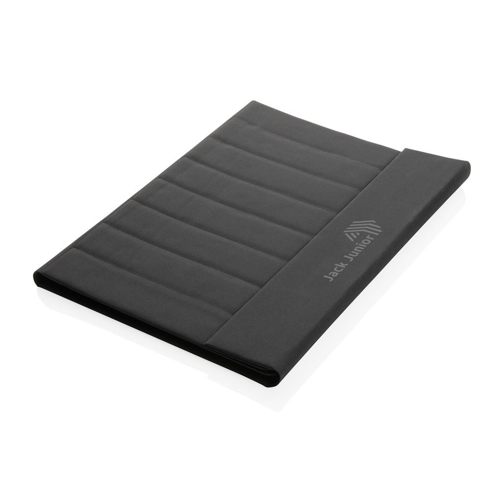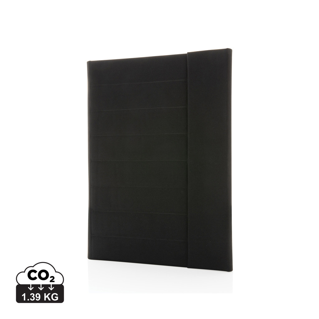 Moderní portfolio ve formátu A4 z kolekce Impact. Uvnitř obsahuje 1 velkou kapsu, 2 dodatečné malé kapsy, poutko na pero a vyměnitelný poznámkový blok z FSC recyklovaného linkovaného krémového papíru (20 stran, 70g/m2). Vnitřní i vnější část je 100 % vyrobena z recyklovaného polyesteru včetně skenovatelné složky AWARE™ garantující obsah recyklátu. Na výrobu bylo využito 3,2 500ml PET lahví a bylo uspořeno 1,95 litrů vody. Z výtěžku každého prodaného produktu z kolekce Impact je navíc přispěno 2 % na podporu iniciativy Water.org. Bez PVC.