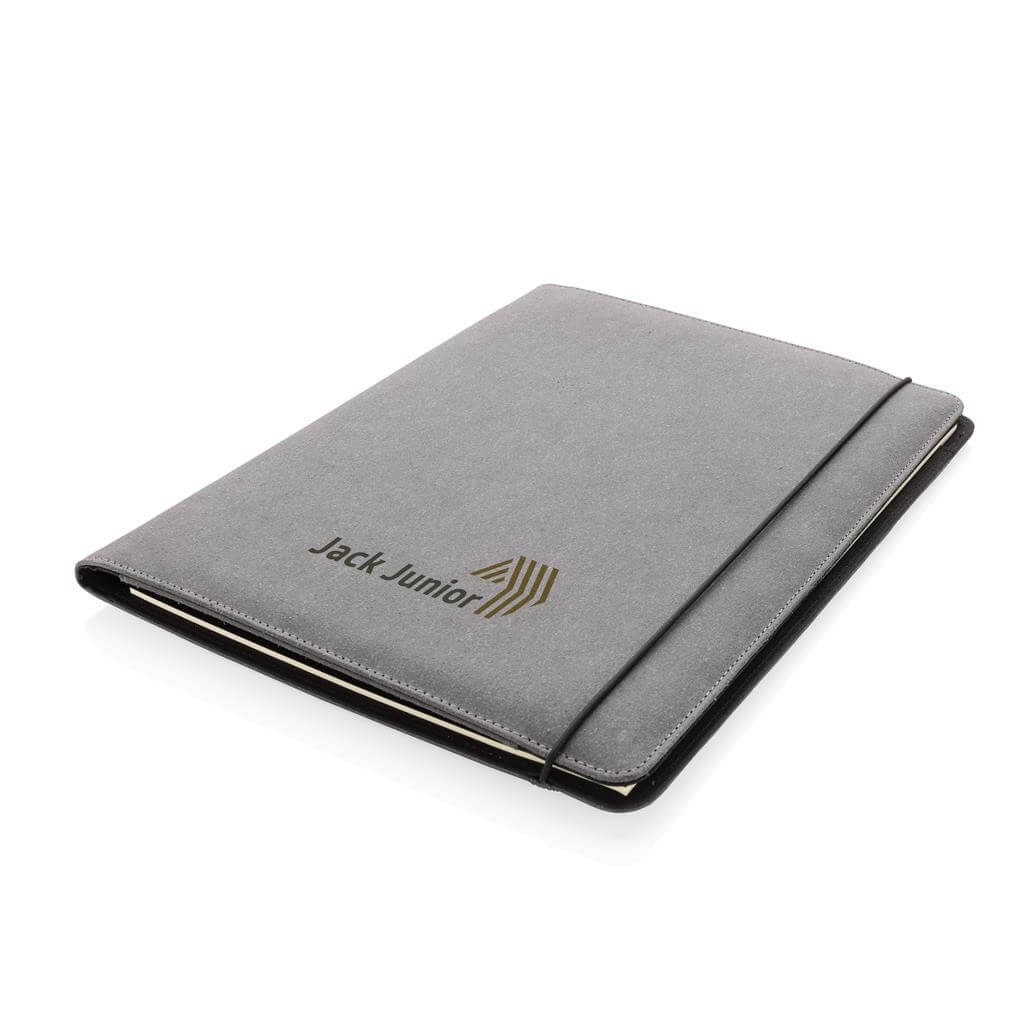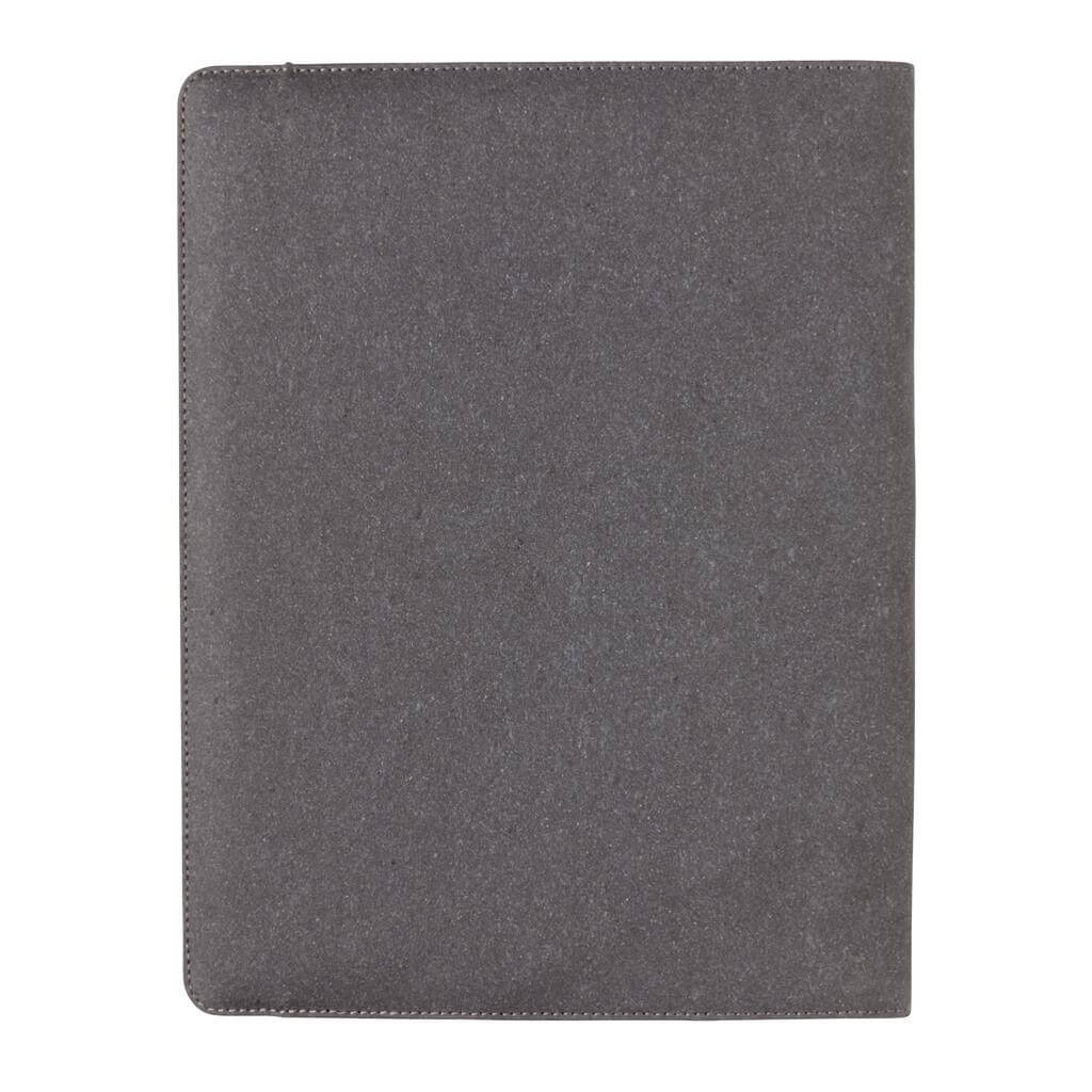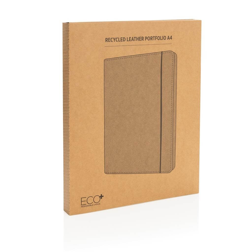 Portfolio ve formátu A4 vyrobené z recyklované kůže s černou elastickou gumičkou. Pro uchování dokumentů, vizitek, karet a dalších esenciálních kancelářských potřeb. 1 velká otevřená kapsa, 3 menší kapsy a 4 sloty na vizitky. Včetně poznámkového bloku s 24 stranami A4 a linkovaným papírem o gramáži 64 g/m2.