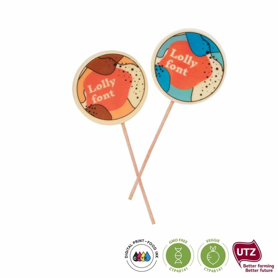 Zahoďte staré zvyky a vykročte moderními způsoby potisku. Nabízíme vám lízátko z bílé čokolády, kterou vám umíme potlačit jedlými barvami. Potisk je možný na jednu přední stranu lízátka. Lízátko má průměr 80mm a hmotnost 40g. Od výroby má spotřebu 8 měsíců.