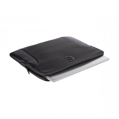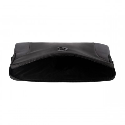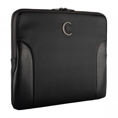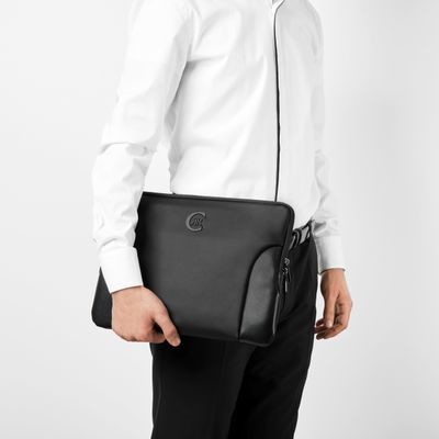 Pouzdro na počítač Forbes, dokonale vyrobené z nádherné měkké matné černé veganské kůže smíchané s černou texturovanou kůží a zdobené výraznou matnou černou kovovou deskou Cerruti 1881, je rozhodně mužné a moderní.
