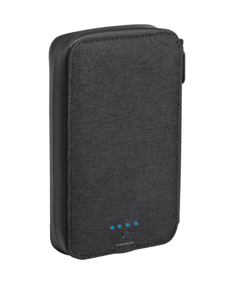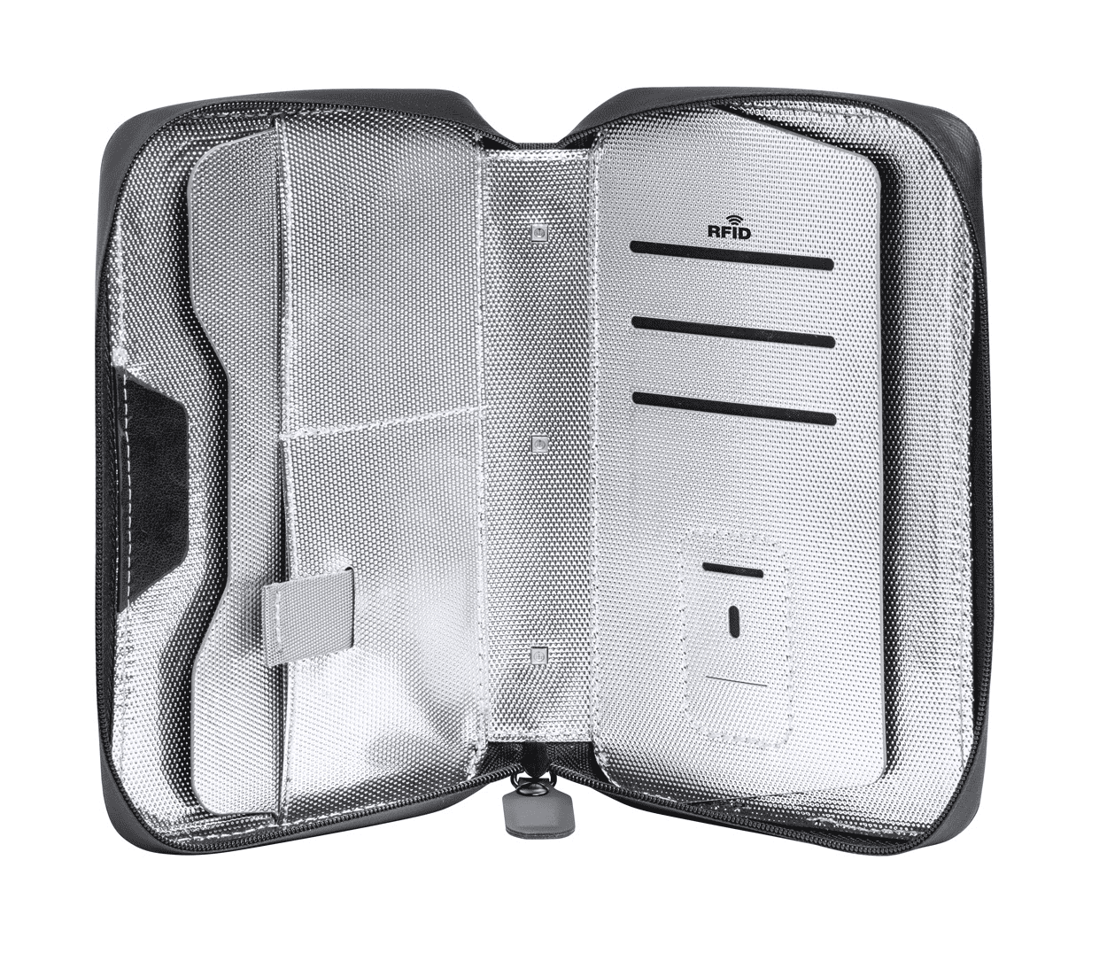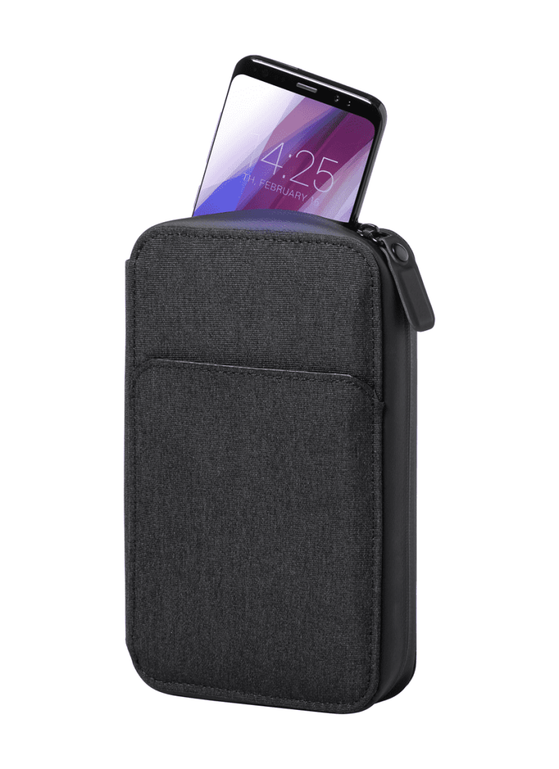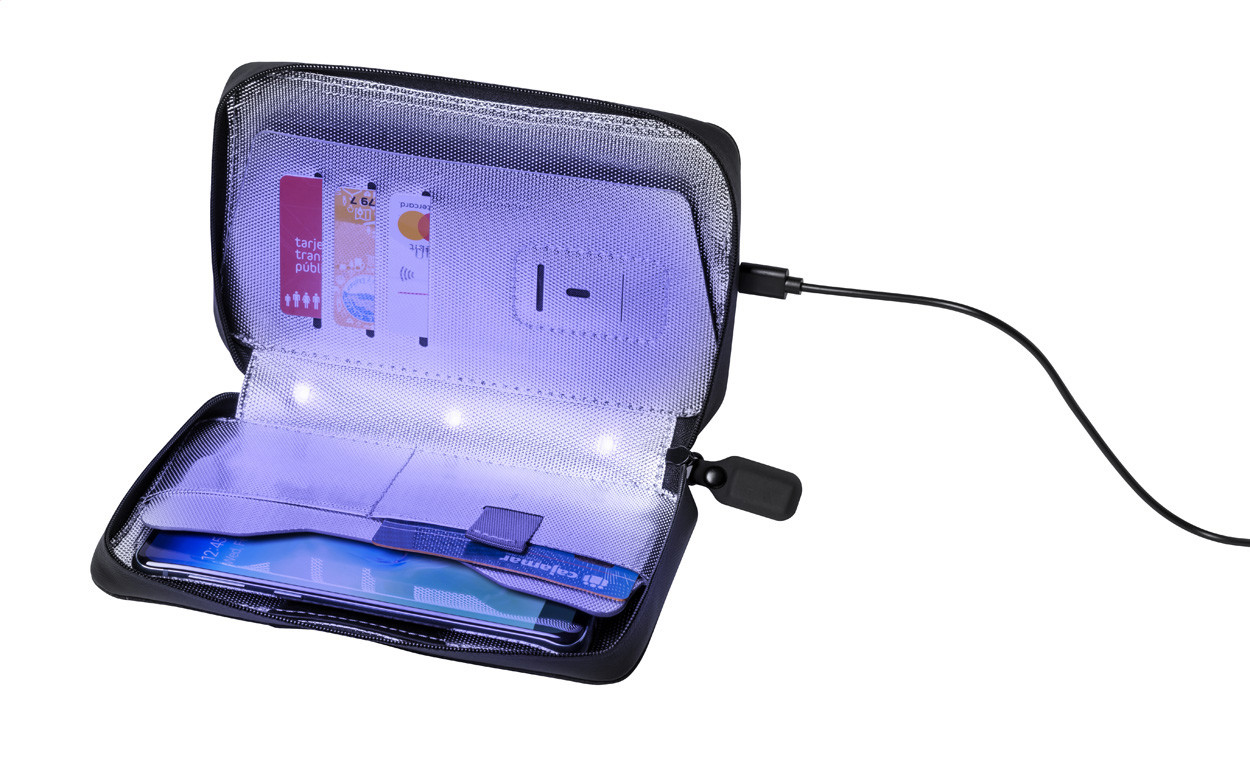 Cestovní pouzdro na zip s ochranou RFID a vestavěnou UV-C sterilizační lampou pro mobilní telefon a karty. Se 4 vnitřními sloty na karty a vnější kapsou. Doba sterilizace 1 a 3 minuty s funkcí automatického vypnutí. V 600D polyesteru a PU kůži. Včetně USB nabíjecího kabelu.