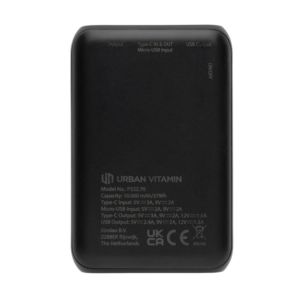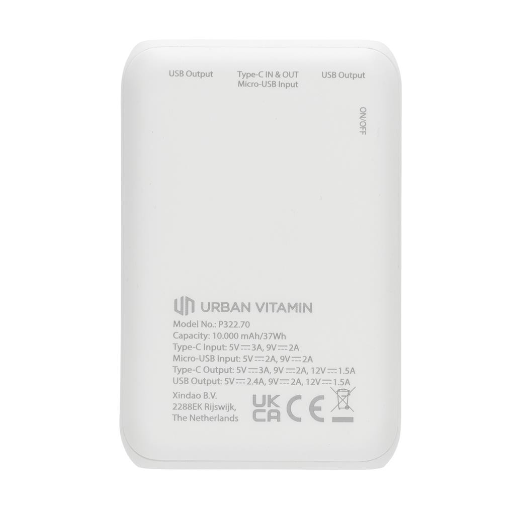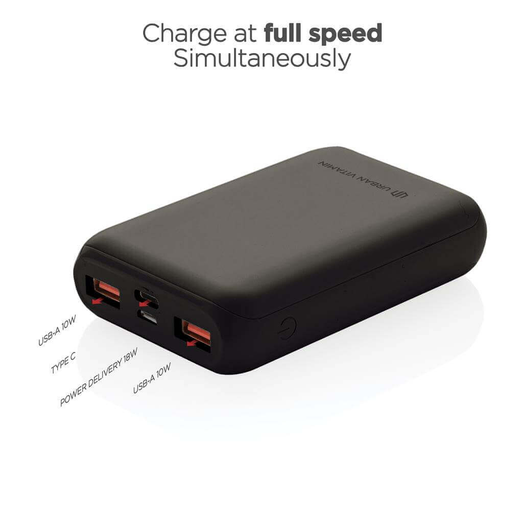 Nabíjejte až 2,5x rychleji! Super rychlá powerbanka značky Urban Vitamin díky 18W PD USB C portu nabije telefon za rekordně rychlou dobu. Na 50 % kapacity baterie nabije již za 30min. Obsahuje kvalitní baterii řady A s kapacitou 10 000 mAh. 2 USB A a 1 USB C port umožňují dobíjet až 3 zařízení naráz (včetně notebooků). Produkty značky Urban Vitamin jsou vyrobeny bez PVC a baleny v ekologickém balení. USB C vstup: 5V/3A, 9V/2A; Micro USB vstup: 5V/2A, 9V/2A; USB C výstup: 5V/3A, 9V/2A, 12V/1,5A; USB A výstup: 5V/2,4A, 9V/2A, 12V/1,5A. 2 baterie typu Li-poly v balení.