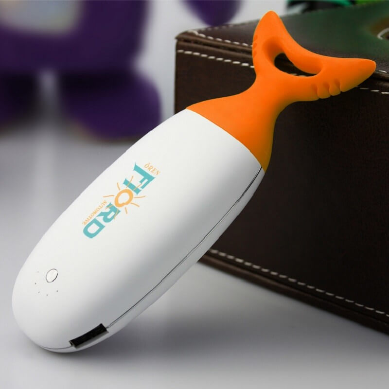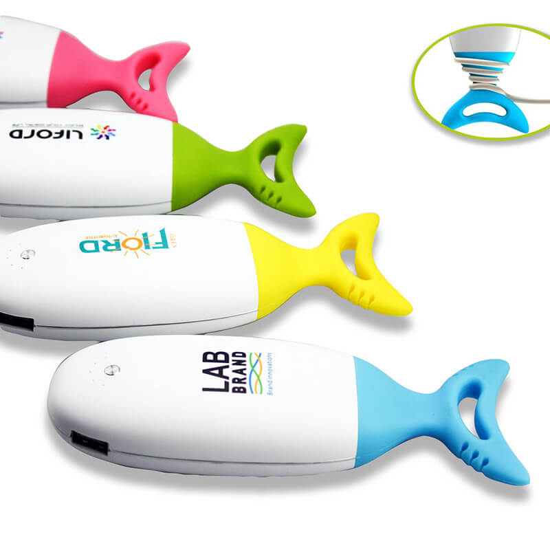 POWER BANK (MOBILNÍ NABÍJEČKA) (3000/4000/5000/6000 mAh) VE TVARU RYBY. Originální Power bank ve tvaru ryby, přičemž ocas slouží i jako praktický držák kabelu. Nabití Power Bank zajistíte přes USB konektor počítače (případně síťový adaptér) a přes micro USB, popř. jiný konektor následně nabijete Váš mobilní telefon nebo jiné zařízení. Plně nabitá Power Bank zajistí několikanásobné nabití mobilního telefonu v závislosti na kapacitě baterie Power banky a na kapacitě baterie telefonu (3000 mAh cca 1 - 2x, 4000 mAh cca 2x, 5000 mAh cca 2-3x a 6000 mAh cca 3-4x). Nabíjí iPhone, mobily, MP3, kamery apod. LED diody zobrazují zbývající kapacitu baterie Power banky, různobarevné LED podsvícení průhledné ocasní ploutve s dvěma módy - zábavné světelné efekty nebo nouzové červené světlo s různou frekvencí blikání. Široké možnosti reklamního potisku plastového těla - buď tampon, nebo i celobarevný CMYK.