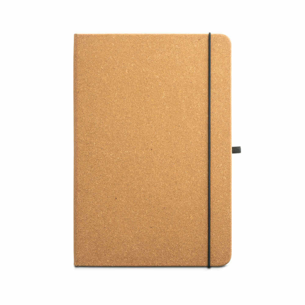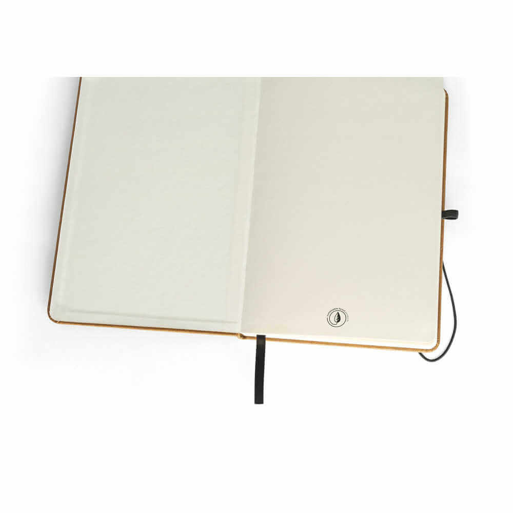 A5 notepad z recyklované kůže se 192 slonovinovými stranami. Držák pera (pero není součástí balení), černý elastický pas a páska se záložkou. Obsahuje vnitřní kapsu.140 x 210 mm