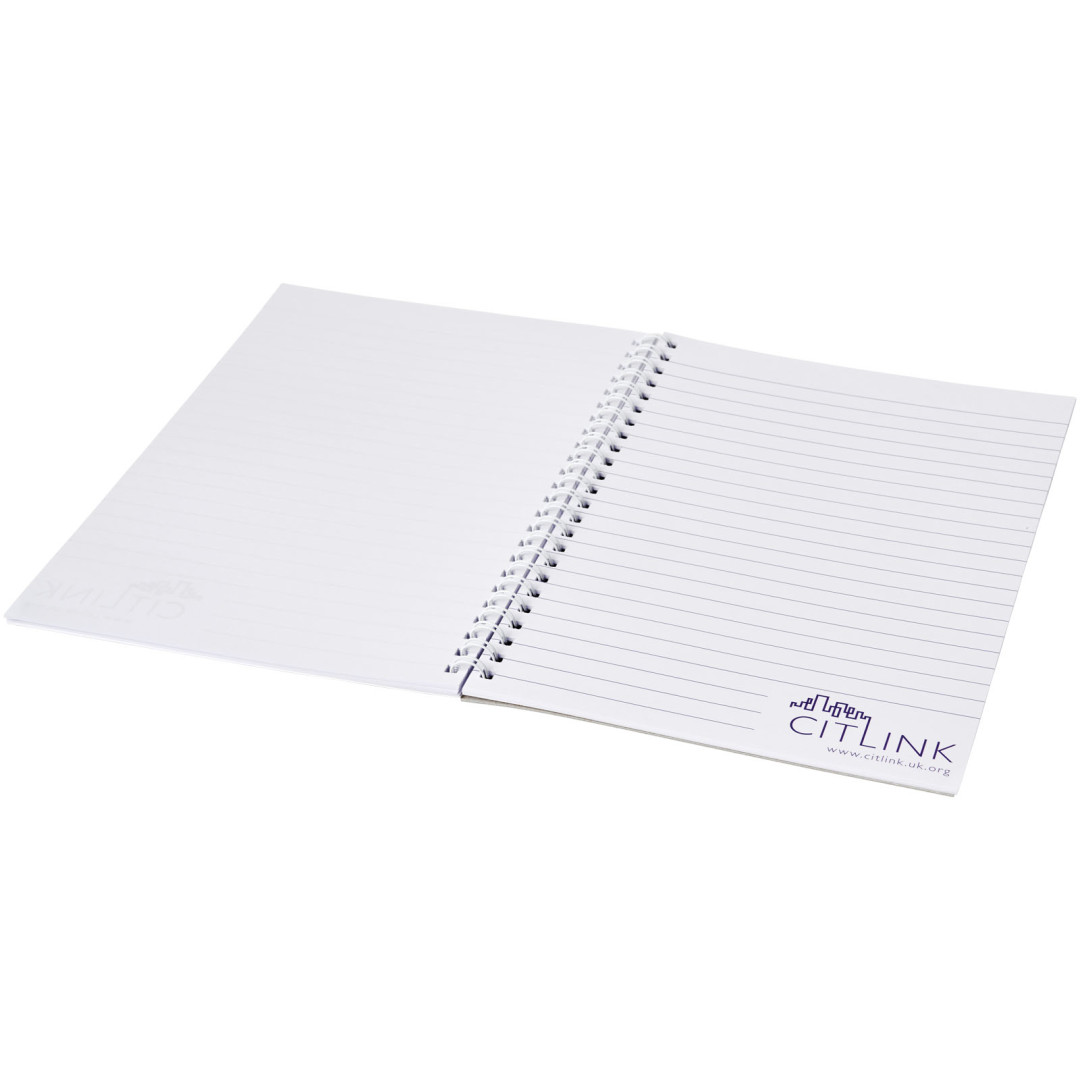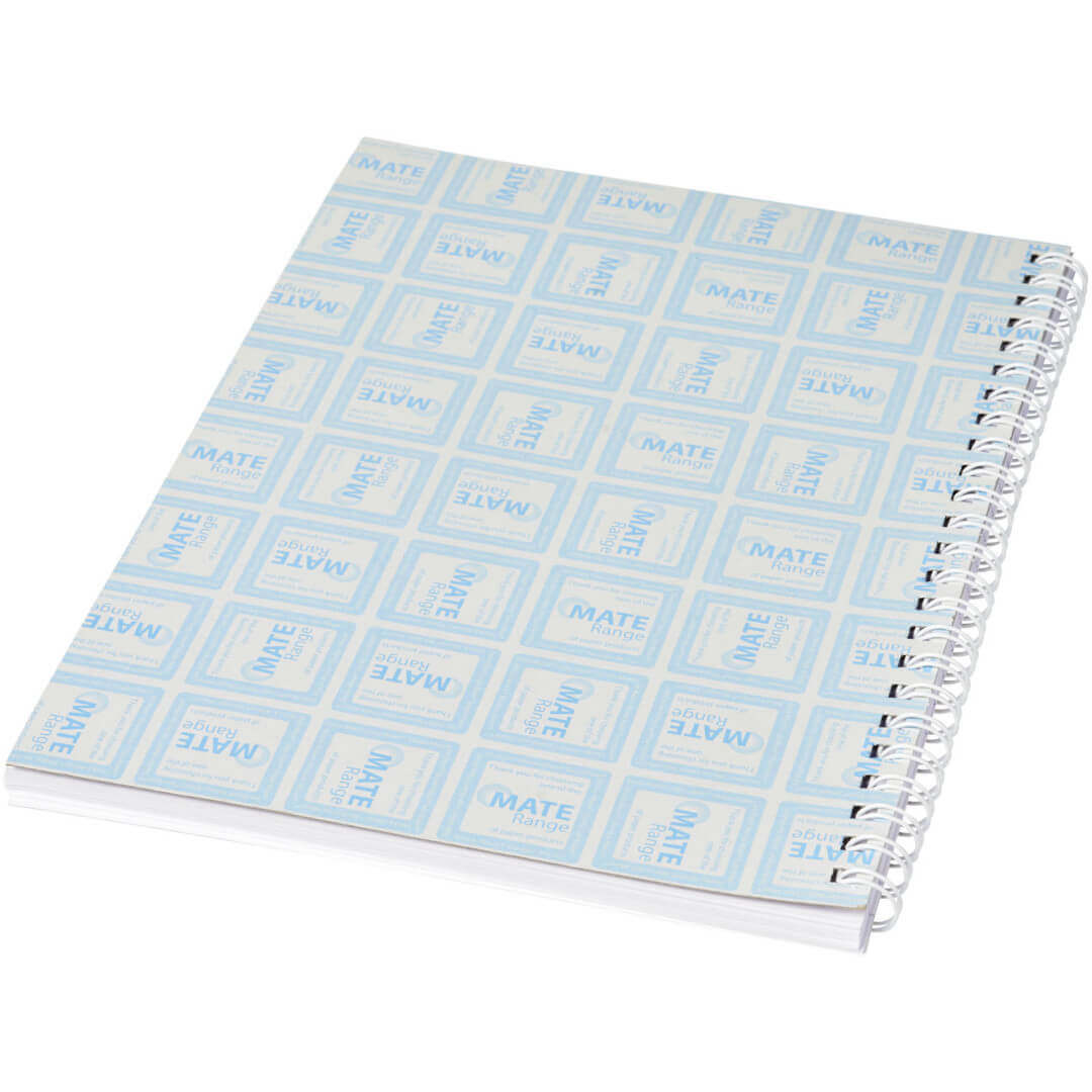 Spirálový poznámkový blok Desk-Mate® A4 Tento poznámkový blok obsahuje bílý nebo černý drát. Dostupné v různých velikostech. Obsahuje lesklé desky (250g/m2) a čistý papír (80g/m2). Standardně se dodávají v balení po 50 listech, dostupné také po 80 listech. Dekorace je možná na obálce a na každém listu. Papír, 80 g/m2.