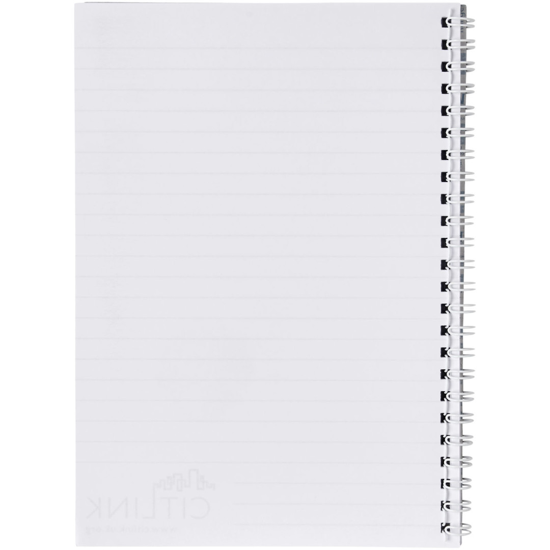 Spirálový poznámkový blok Desk-Mate® A5 Tento poznámkový blok obsahuje bílý nebo černý drát. Dostupné v různých velikostech. Obsahuje lesklé desky (250g/m2) a čistý papír (80g/m2). Standardně se dodávají v balení po 50 listech, dostupné také po 80 listech. Dekorace je možná na obálce a na každém listu. Papír, 80 g/m2.
