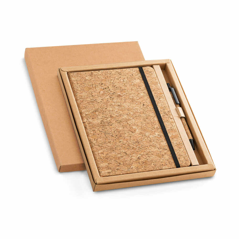 Sada poznámkového bloku A5 a korkového kuličkového pera. Notepad se 192 lemovanými slonovinovými stránkami. Kuličkové pero s modrým inkoustem. Dodává se v kartonové dárkové krabičce.140 x 210 mm