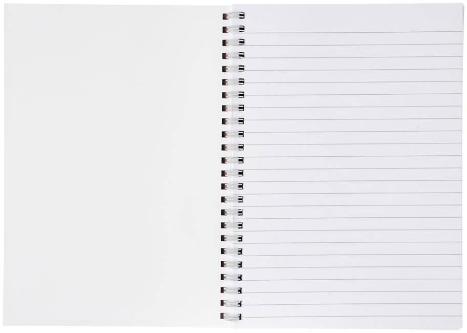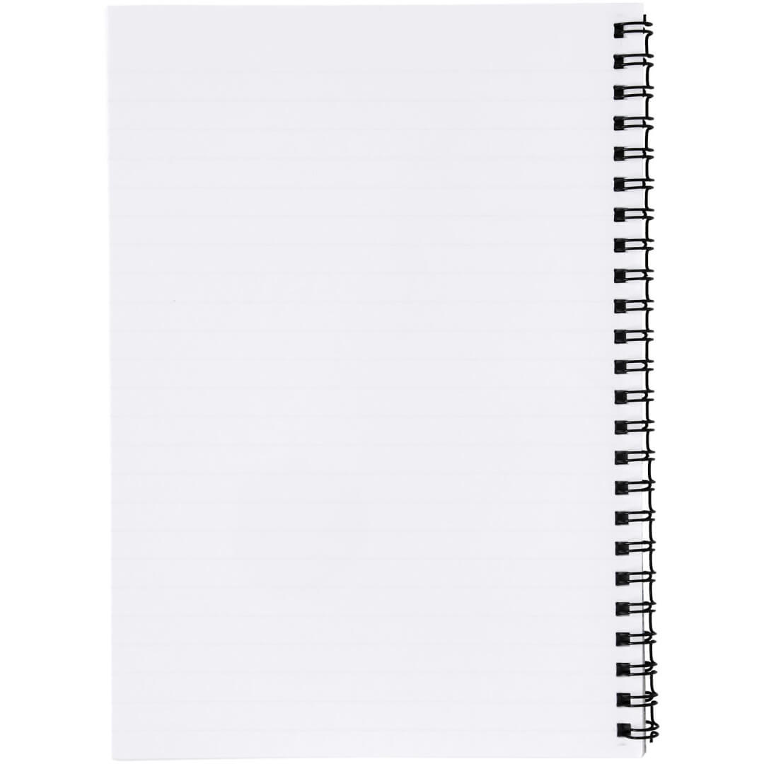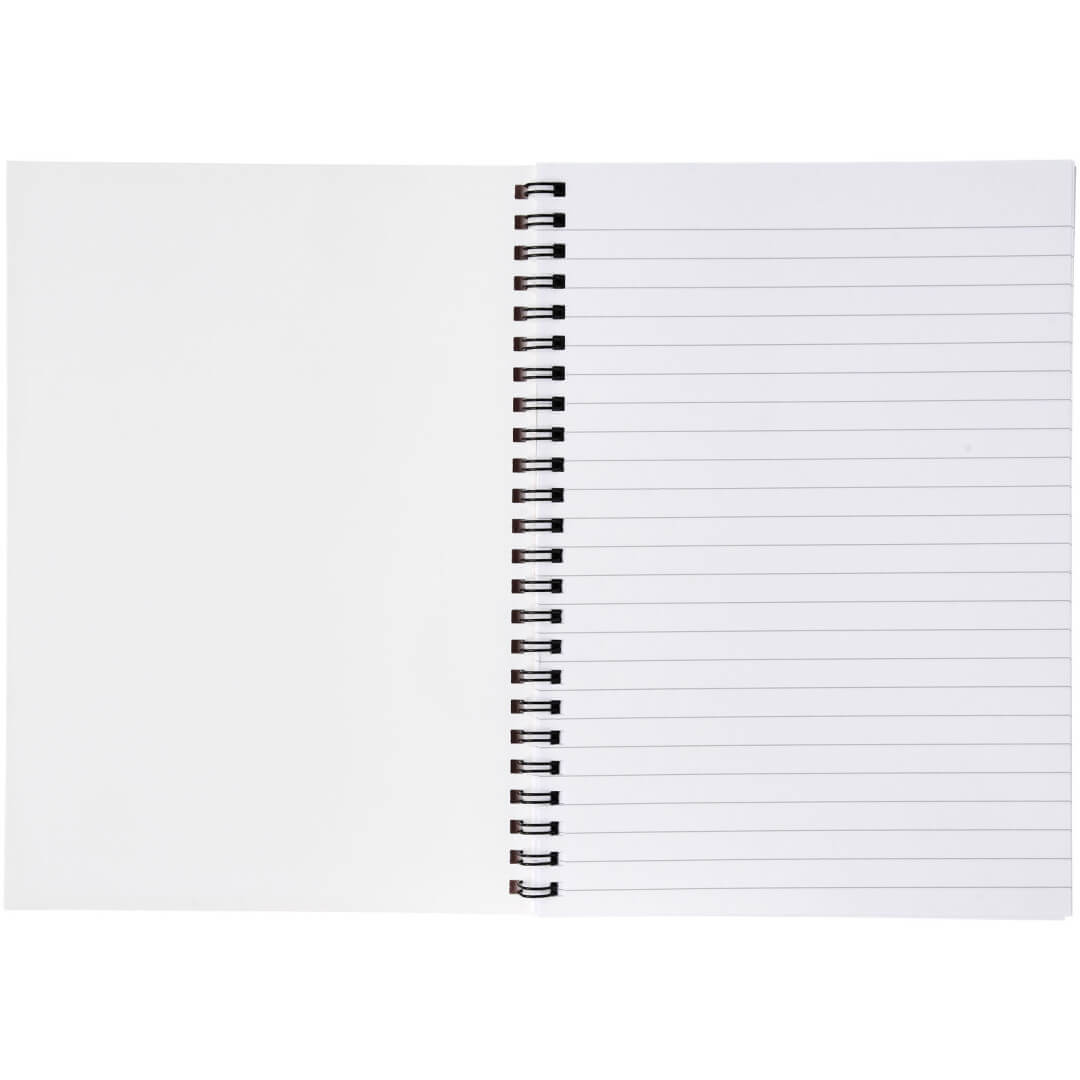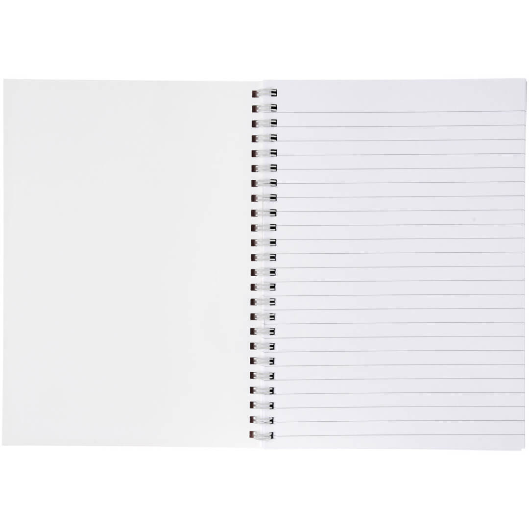 Spirálový poznámkový blok Desk-Mate® A5 Obsahuje 50 čistých listů (80 g/m2) papíru a (450 g/m2) obálku. Obálka je odolná proti roztržení a vodě. Bílý drát. Dekorace je možná na obálce a na každém listu. Papír, 80 g/m2, PP plast.