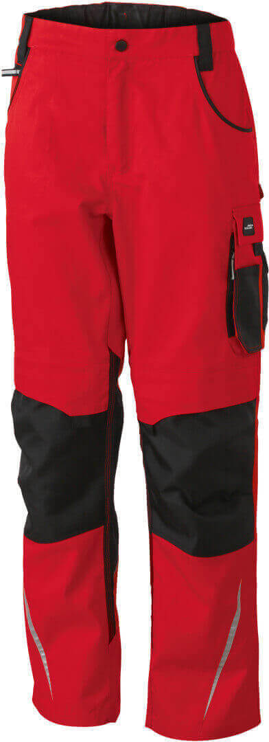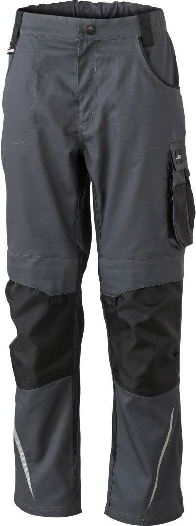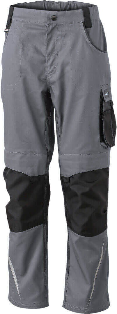 260g/m², 65% polyester, 35% bavlna, lemování: 100 polyamid Cordura® odolný materiál, několik multifunkčních kapes, vyztužené švy, reflexní prvky a elastický pas s poutky na pásek, ve třech různých provedeních (krátké, střední a dlouhé kalhoty)