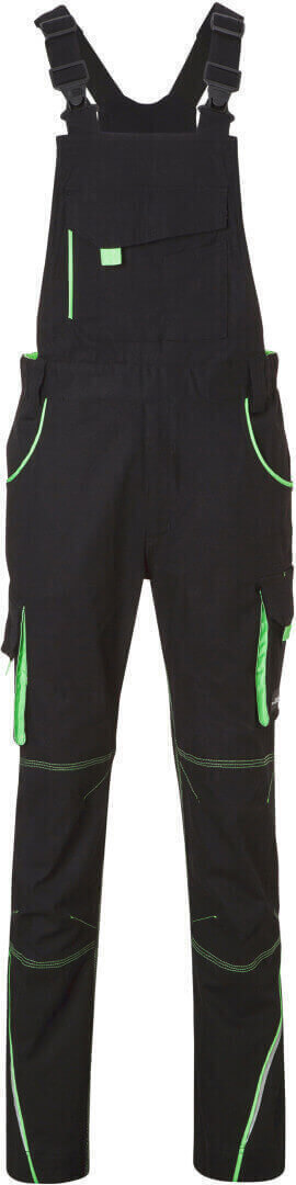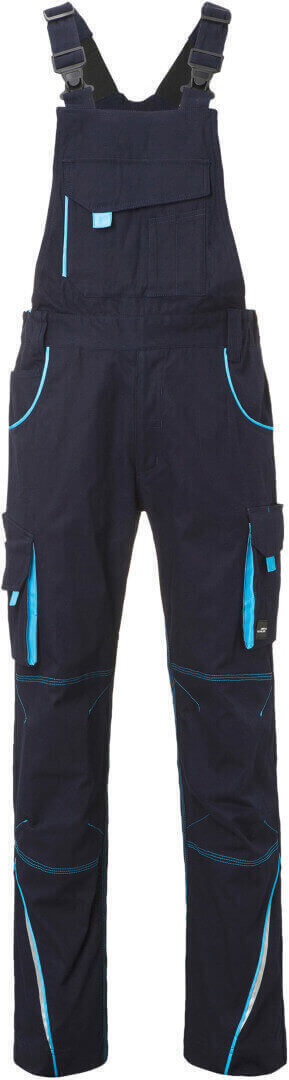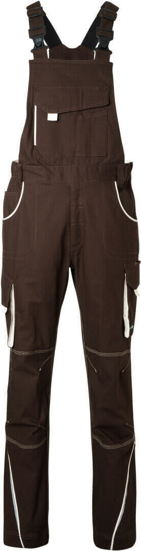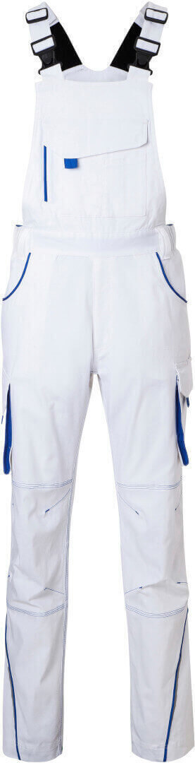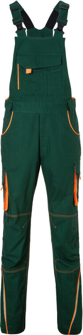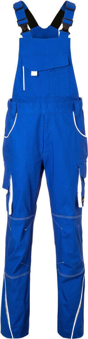 250g/m², 97% bavlna, 3% elastan lehké elastické plátno, pohodlné nošení díky elastanu a ergonomickému střihu, odolné trojité prošití, lacl s nastavitelnými elastickými šlemi, kapsa na metr, kapsy na nářadí, držáky na pera, kapsa na mobil a velká kapsa na zip na laclu, reflexní prvky na