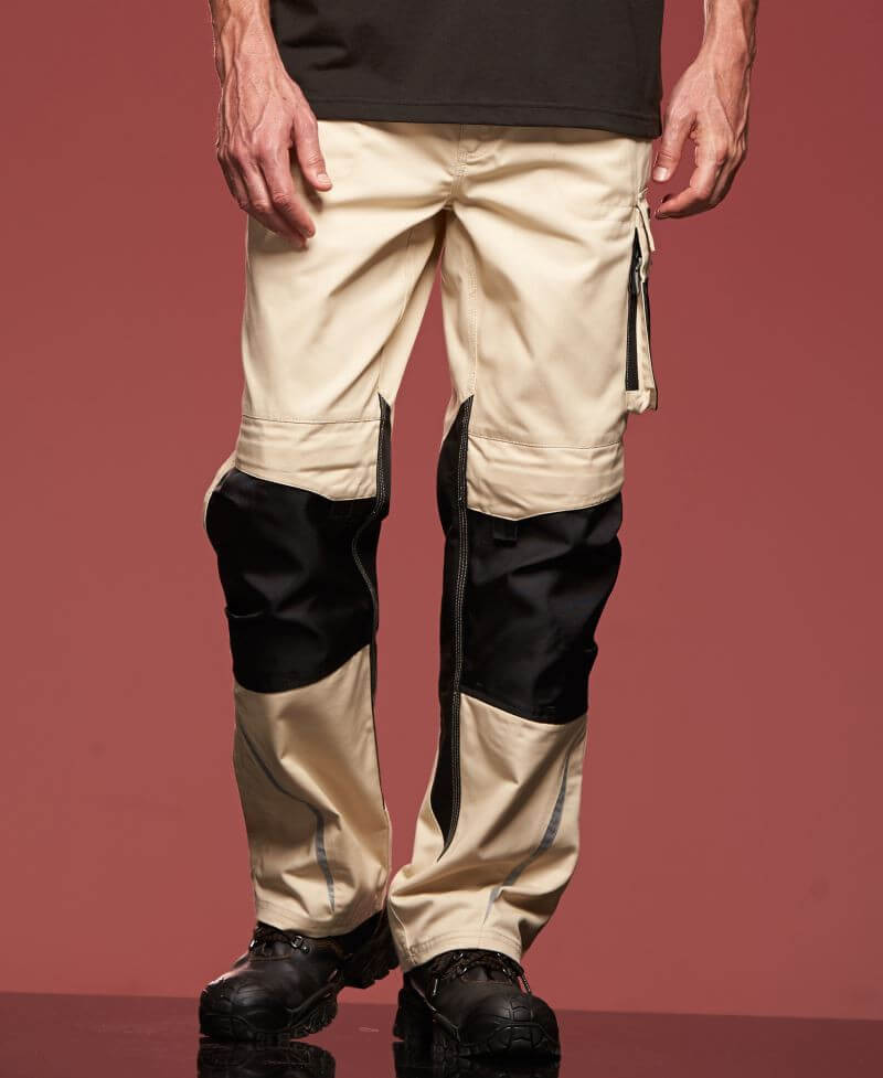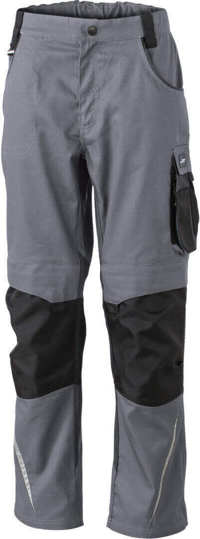 Pracovní kalhoty s elastickým lemem, poutky na pásek, kapsy na kolenní výztuže Cordura®, 2 kapsy na zip, různé kapsy na nářadí, odolná látka, reflexní prvky (bez ochranné funkce) vpředu a vzadu. Doporučené prát na max. 60 °. Vyrobeno z 65% polyesteru a 35% bavlny, polyamidu.