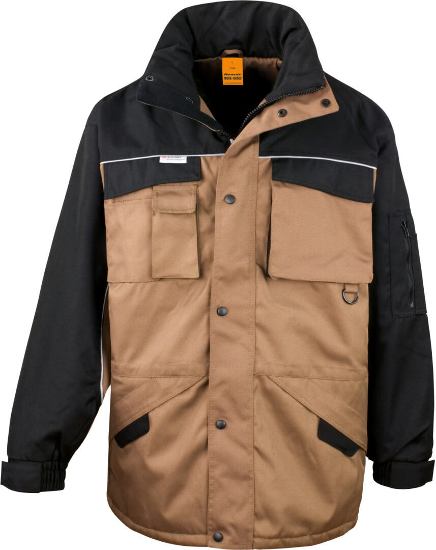 vnější vrstva: 600D oxford taslan s PU vrstvou, vnitřní vrstva: 160g/m² tepelně izolační polyesterové vlákno, podšívka: 190T Taffeta® se stojáčkem má několik kapes, zesílené švy a reflexní lemy, na rukávech jsou nastavitelné manžety na suchý zip, má po celé své délce zip, který je krytý légou s patenty, z kvalitního a vysoce odolného materiálu