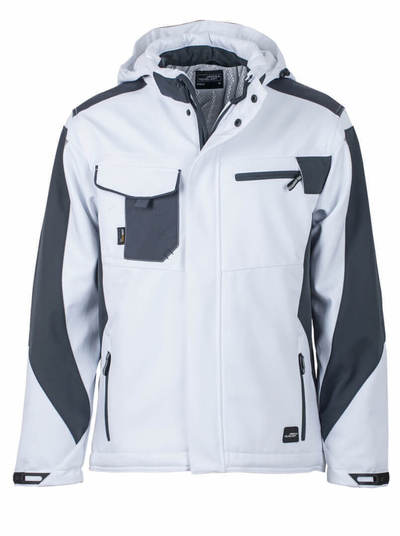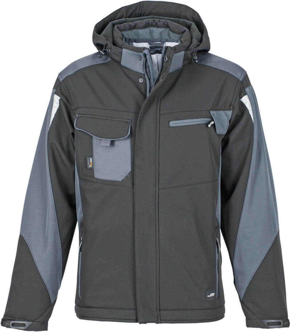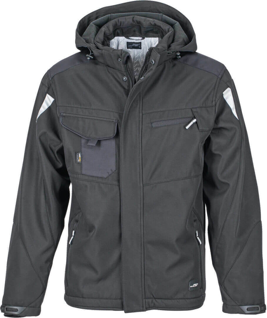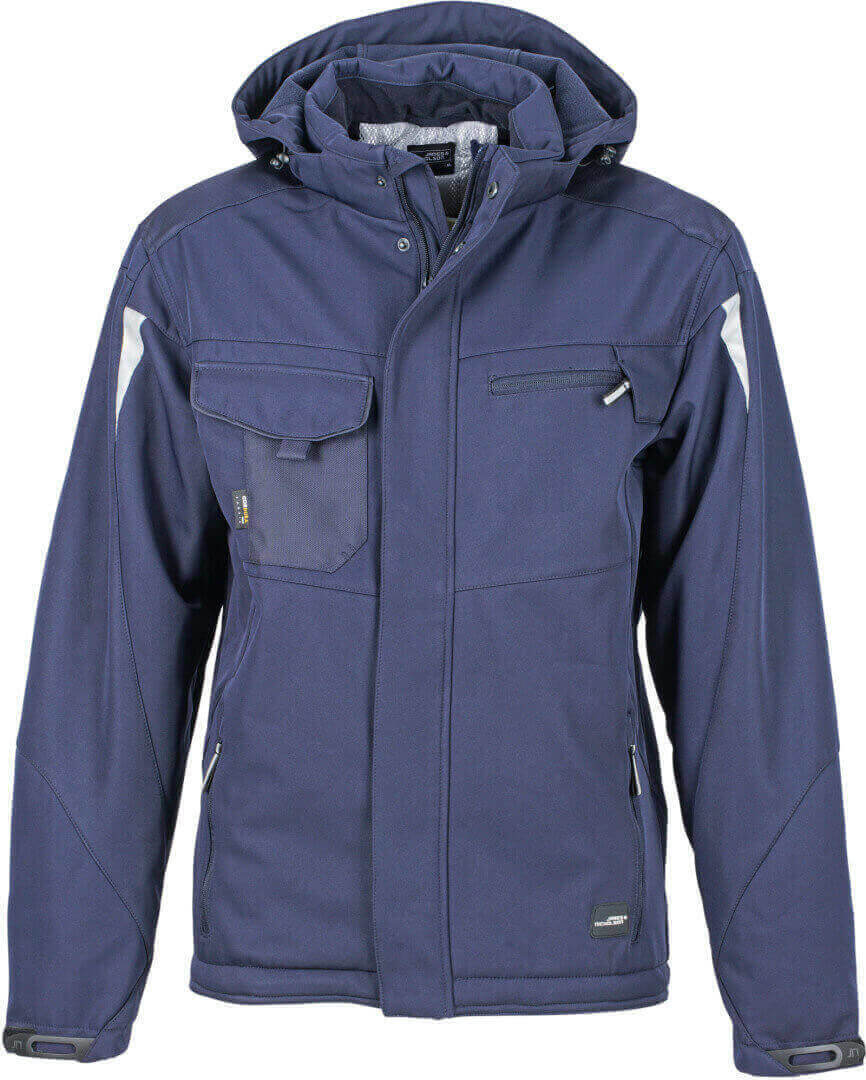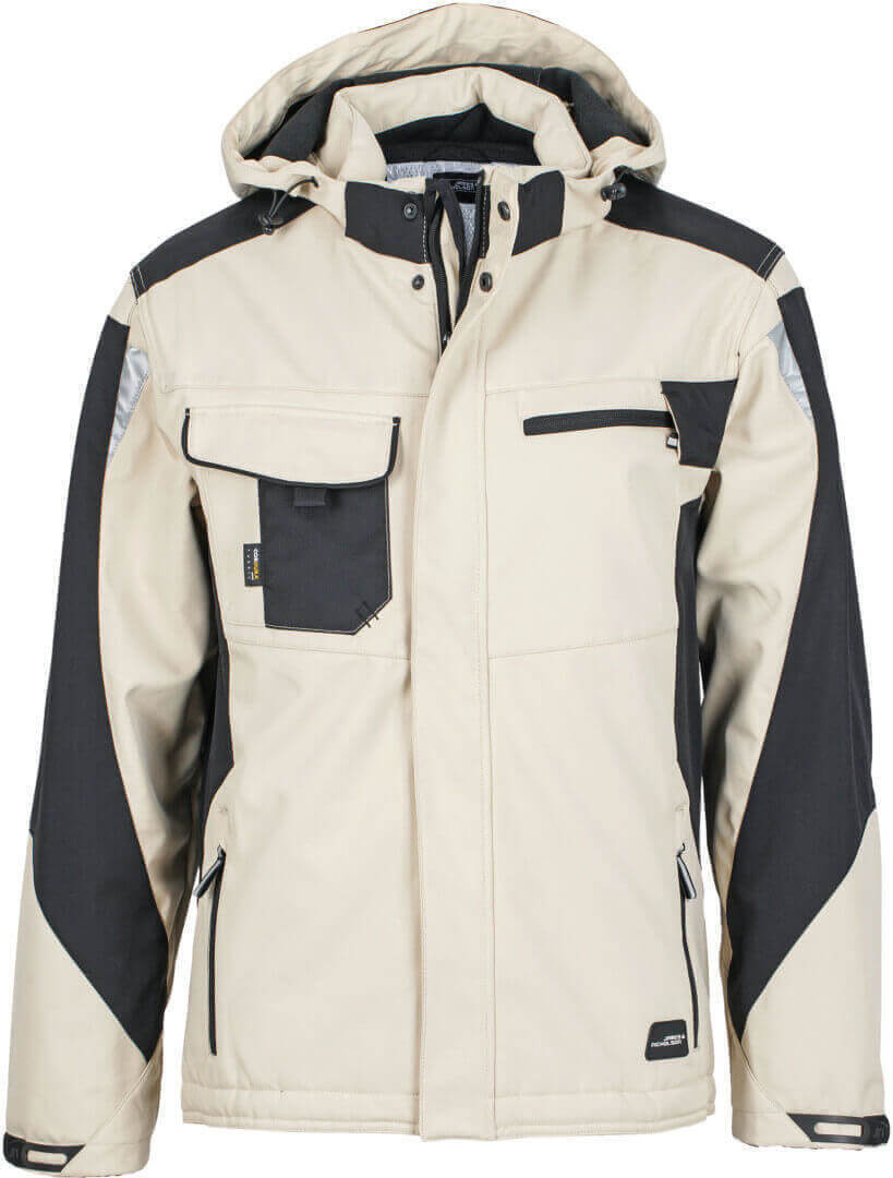 100% polyester, vnitřní vložky: 100% polyamid stojáček a odnímatelná kapuce, vyztužené ramenní části, krytý přední zip, boční kapsy na zip, náprsní kapsa, vnitřní kapsa a kapsa na mobilní telefon, na rukávech a zádech jsou reflexní prvky a na zádech zip pro dekoraci, límeček a manžety jsou z vnitřní