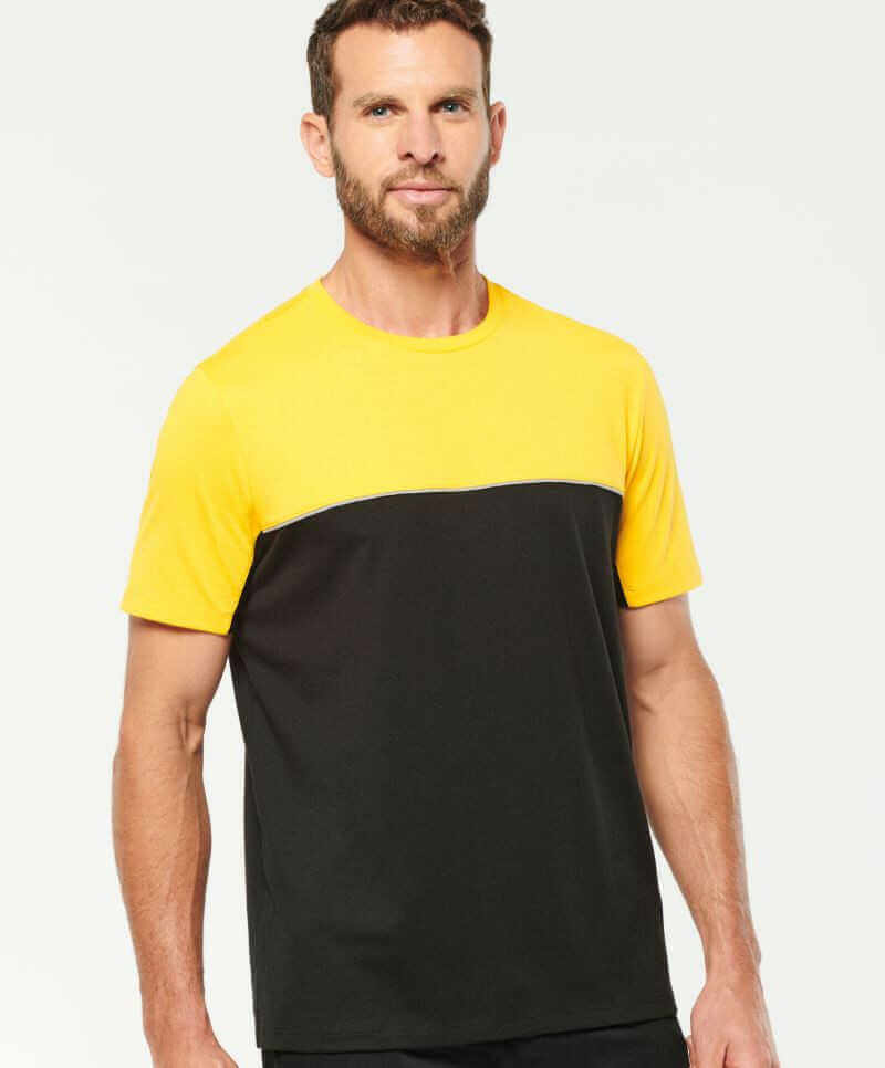 Materiál: 190 g/m², 60% česaná bavlna, 40% recyklovaný polyester. Přizpůsobený střih, žebrovaný úplet, výstřih v kontrastní barvě, dvojité prošívání na rukávech a lemu, kontrastní lemování, úprava proti žmolkování, štítek TearAway, praní na 60°.