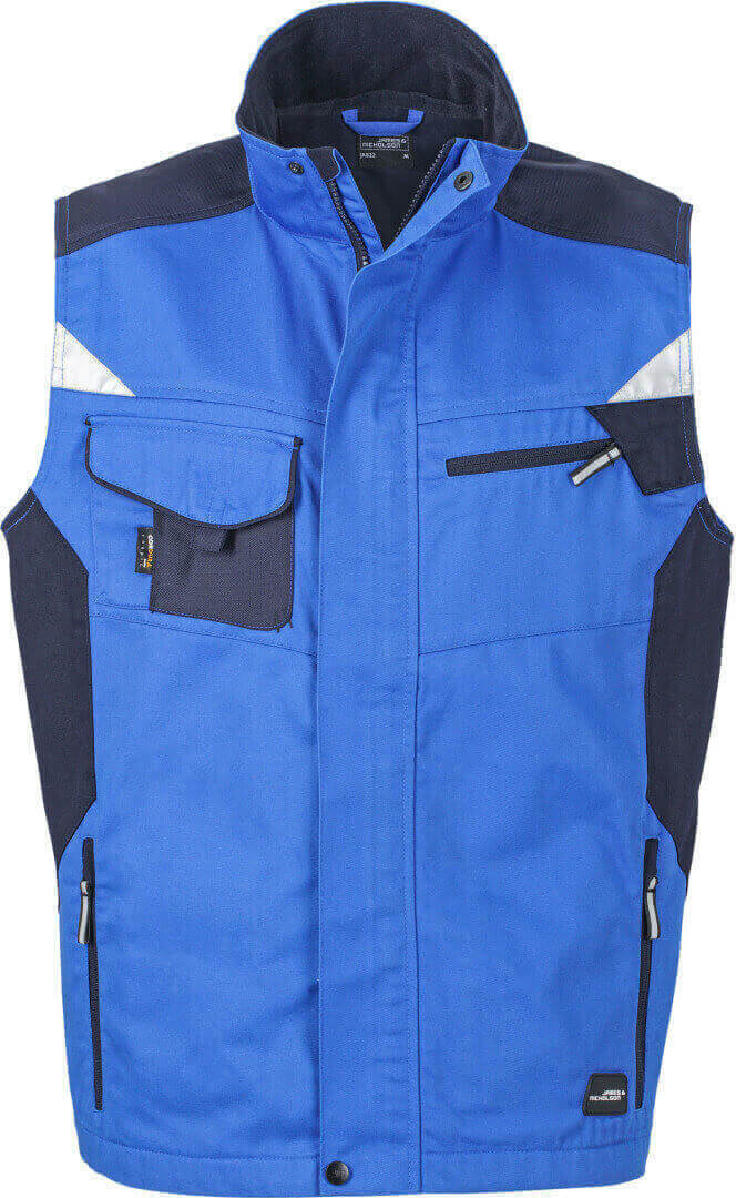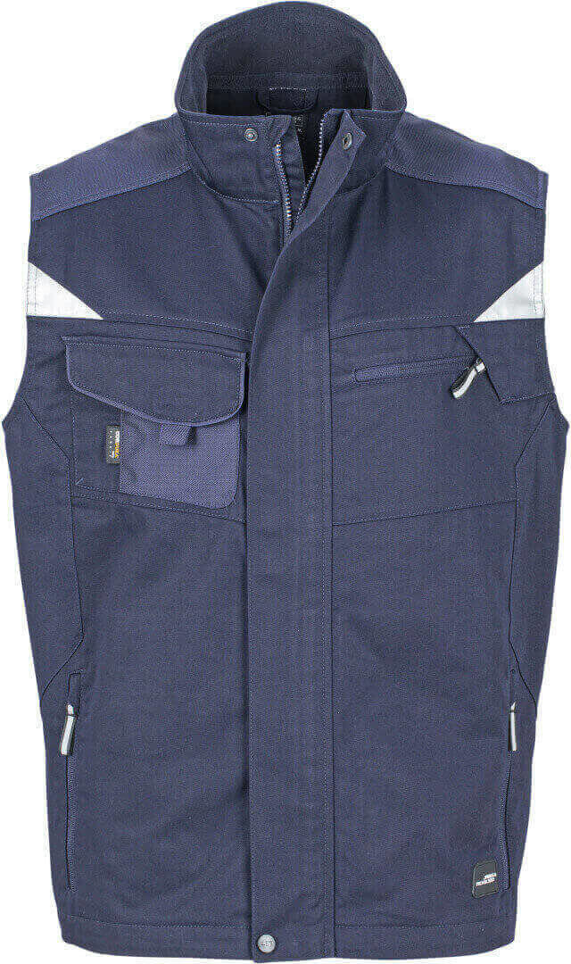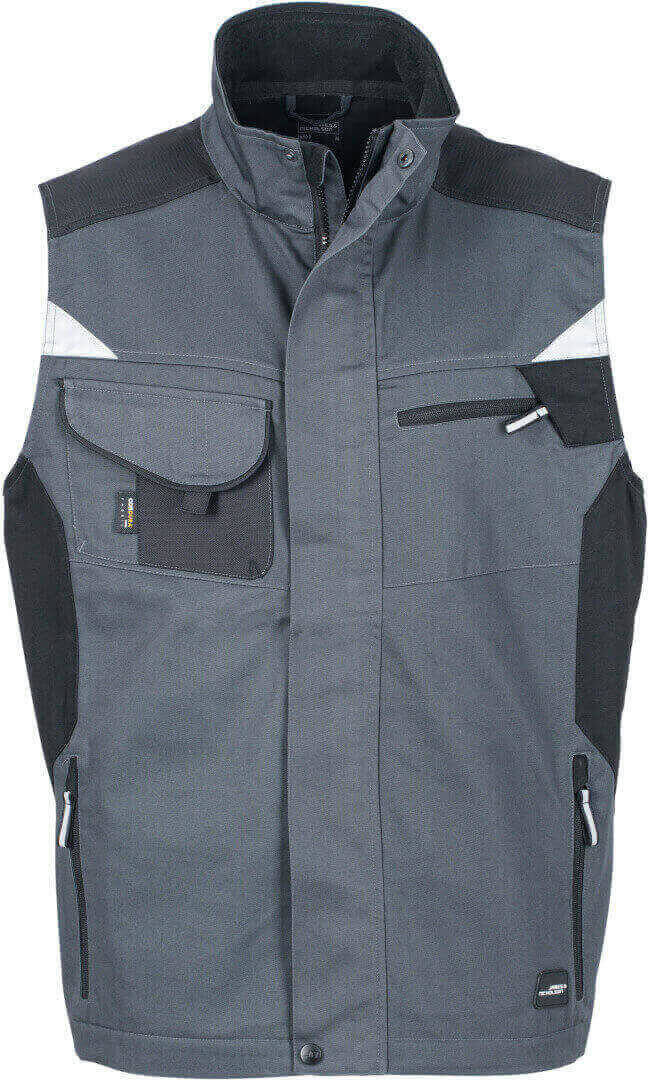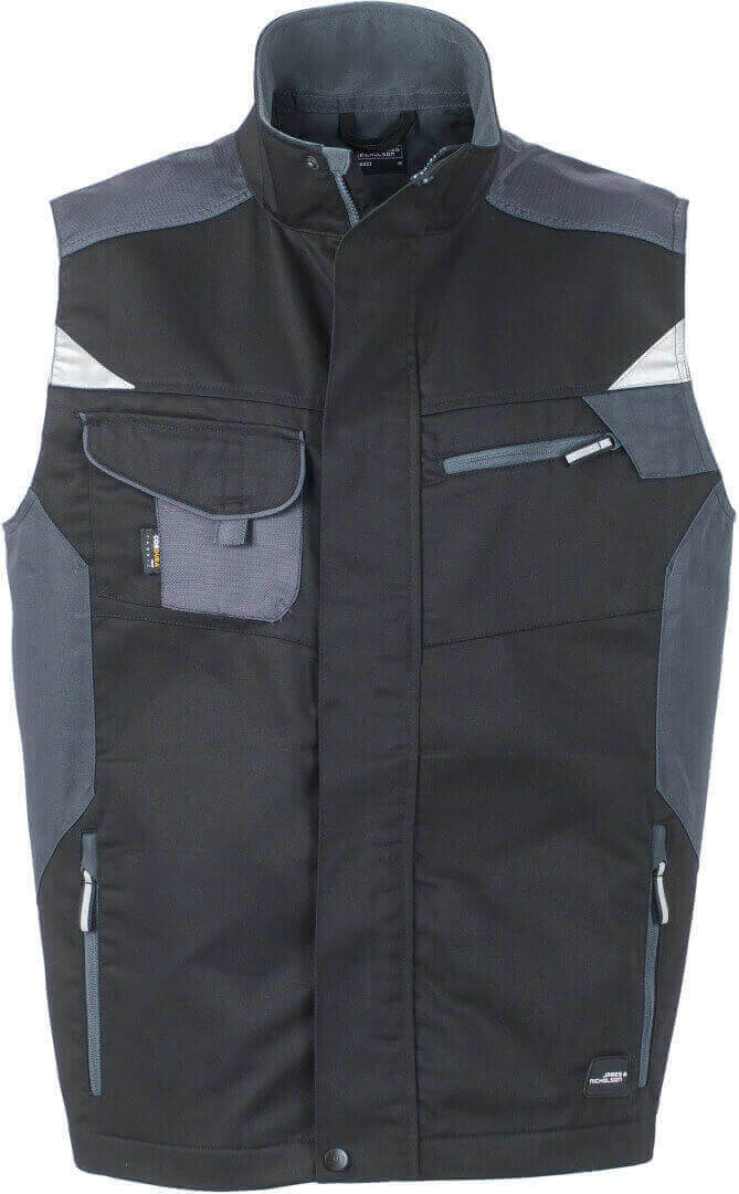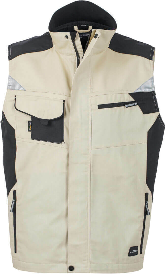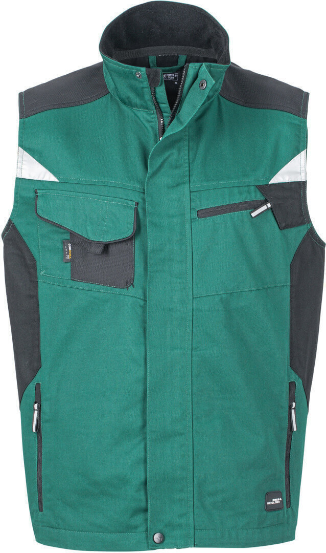 250g/m², vnější vrstva: 65% polyester, 35% bavlna, vnitřní vložky: 100% polyamid stojáček, vyztužená ramenní část, krytý přední zip, větrací otvory na zádech, boční kapsy, náprsní kapsa a vnitřní kapsu na zip, vnitřek límečku z měkkého mikrofleecu, vesta je vyrobena z robustní smíšené tkaniny, která je odolná vůči větru