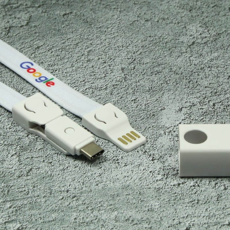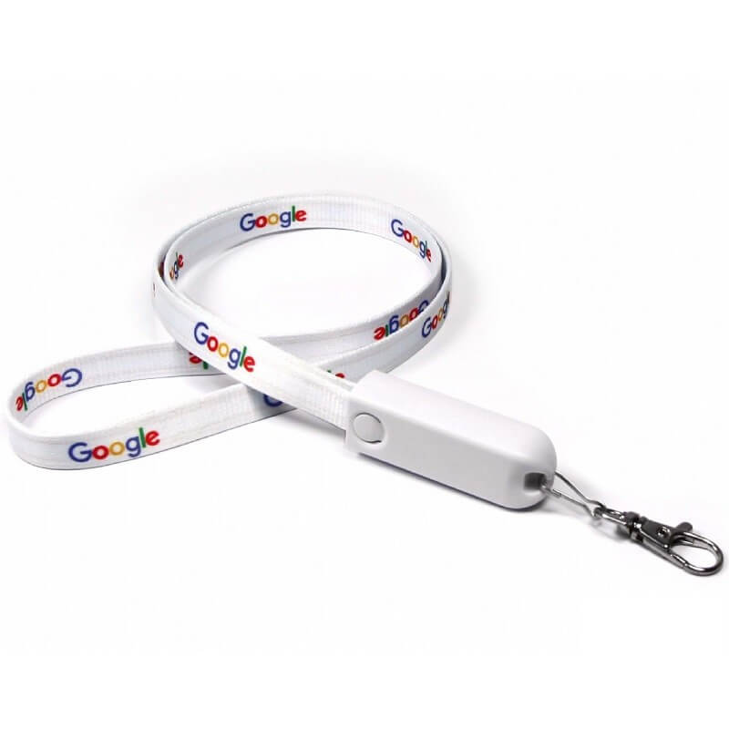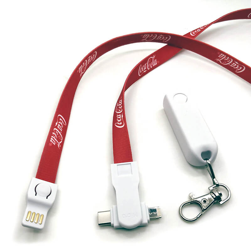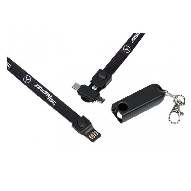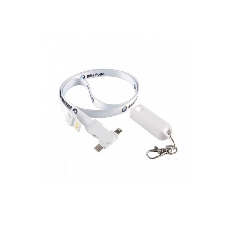 Praktický napájecí kabel 3 v 1 zabudovaný ve šňůrce na krk. Jednoduše odepněte šňůrku z krytu a najdete zde na jedné straně USB konektor a na straně druhé si můžete zvolit buď micro USB, Lightning nebo Type-C. Délka lanyardu-kabelu je 90 cm a můžete vybírat hned z několika barev. Velkou předností tohoto napájecího kabelu je potom velká plocha pro potisk, a to nejen na polyesterové šňůrce, ale také na plastové krytce. Šňůrka je také doplněna praktickou karabinku na zavěšení klíčů či jmenovky.