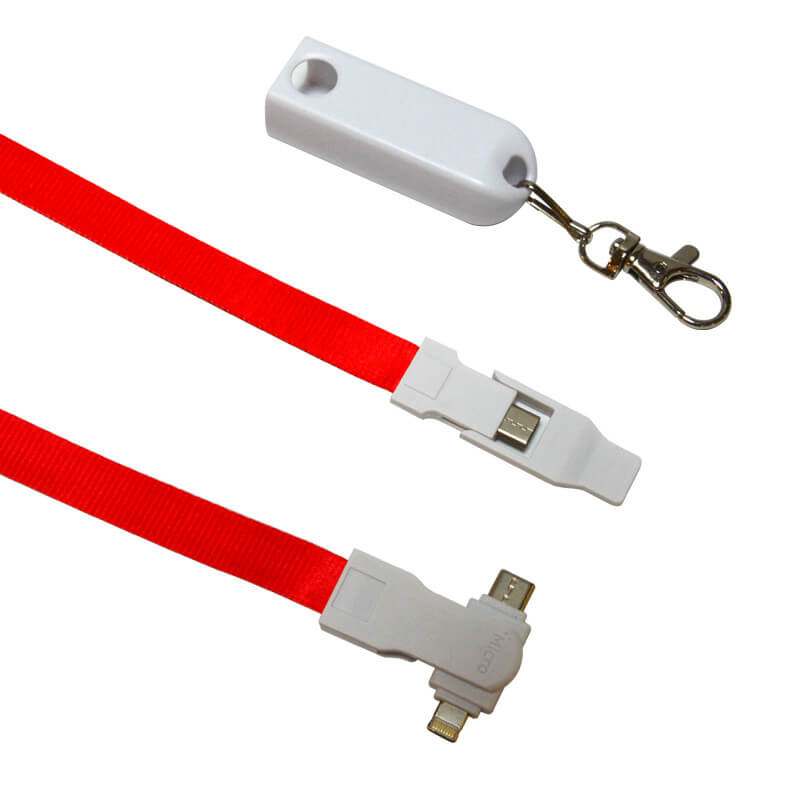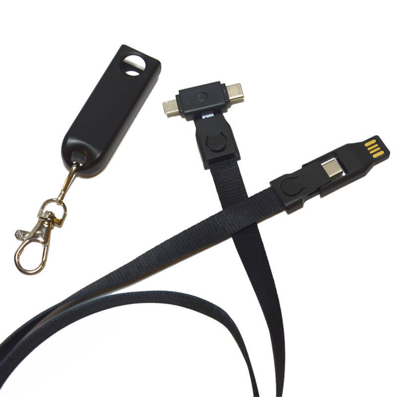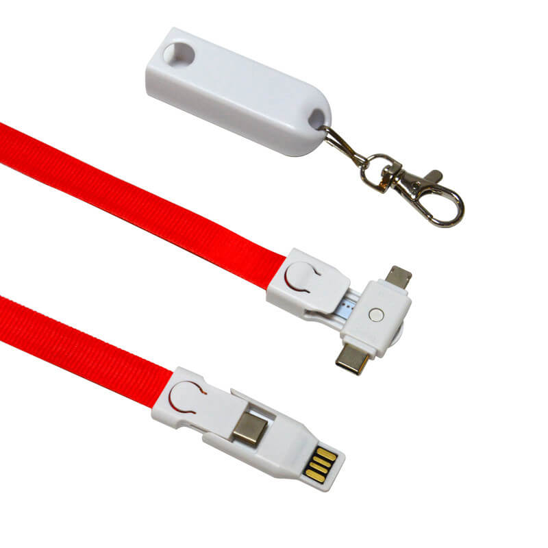 Praktický napájecí kabel 4 v 1 zabudovaný ve šňůrce na krk. Jednoduše odepněte šňůrku z krytu a najdete zde na jedné straně USB A nebo Type-C konektor a na straně druhé si můžete zvolit buď micro USB, Lightning nebo Type-C. Délka lanyardu-kabelu je 90 cm a můžete vybírat hned z několika barev. Velkou předností tohoto napájecího kabelu je potom velká plocha pro potisk, a to nejen na polyesterové šňůrce, ale také na plastové krytce. Šňůrka je také doplněna praktickou karabinku na zavěšení klíčů či jmenovky.