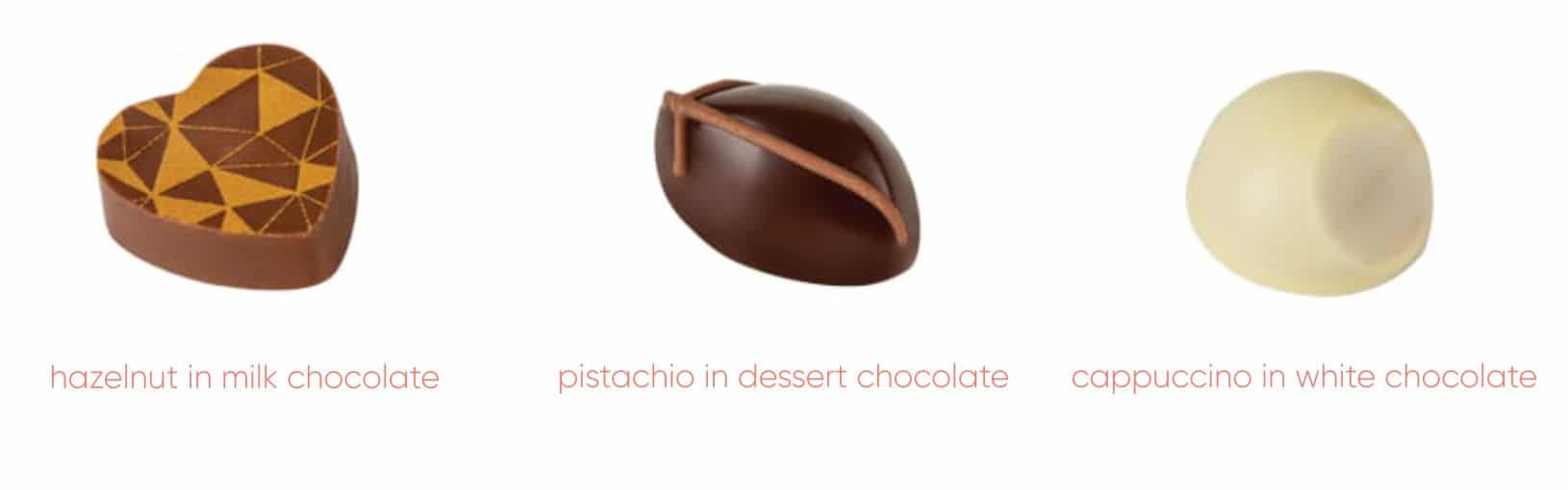 Do bonboniéry jsme zařadili tři druhy čokolád: přírodní pistáciovou v hořké dezertní čokoládě, klasickou kombinaci lískových oříšků a mléčné čokolády a povzbuzující cappuccino v bílé čokoládě.