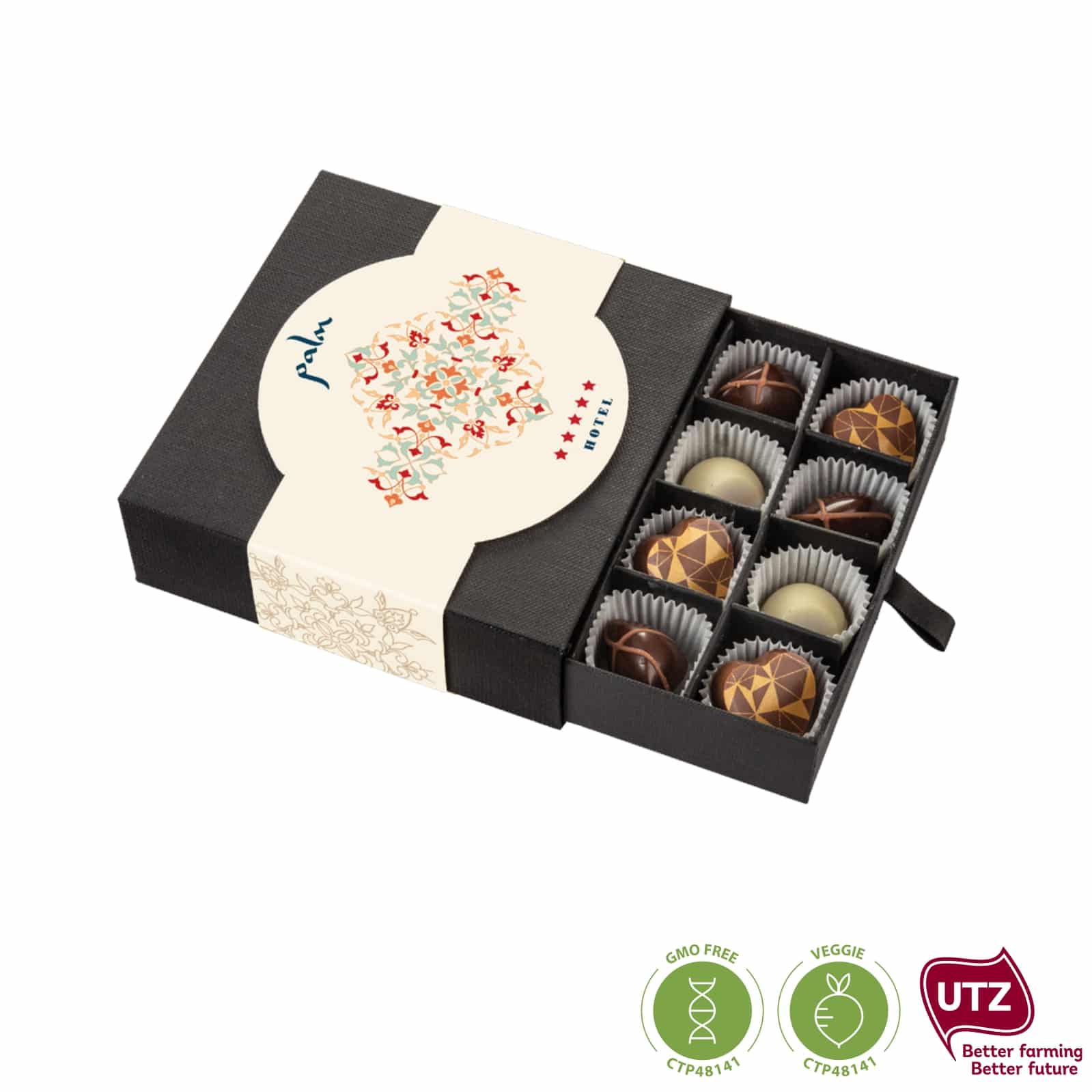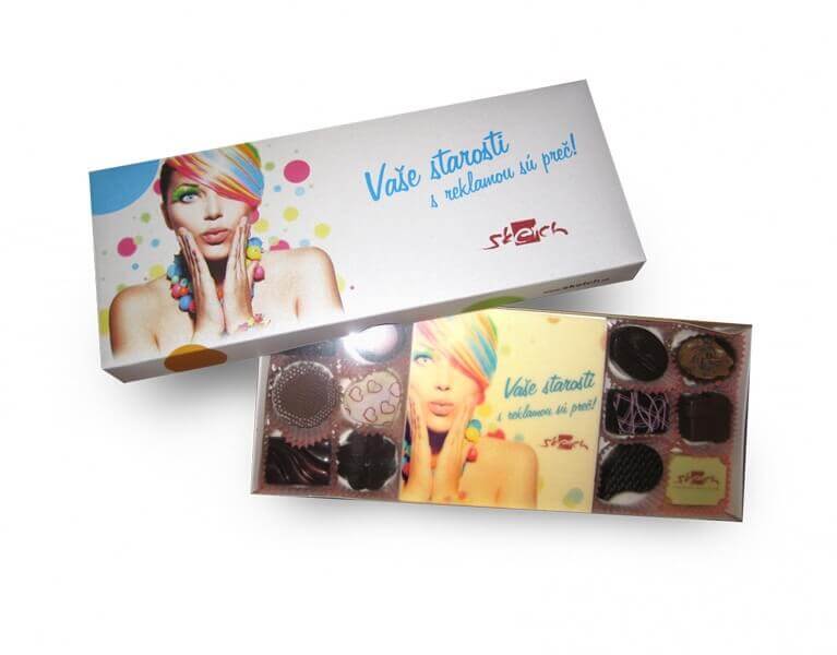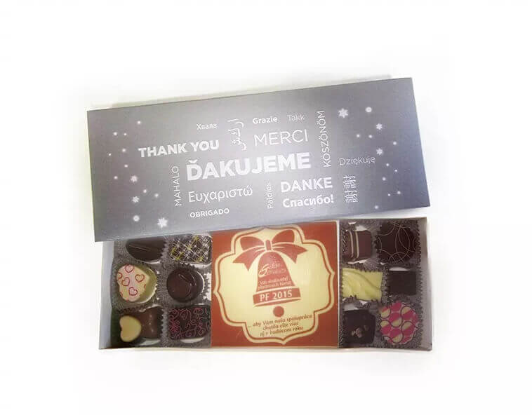 Pralinky Sweets Moments obsahují 16 pralinek ve 3 příchutích. Jsou v černé krabičce pro opětovné použití podle principu „zero waste“. Má standardně bílý papírový štítek, kraftový štítek je volitelný.