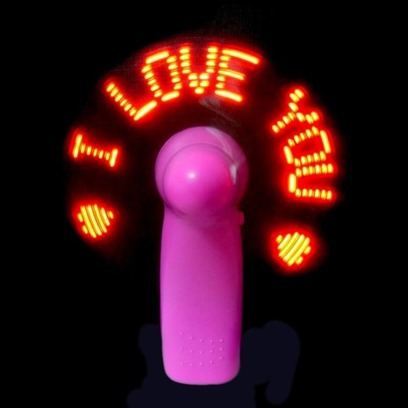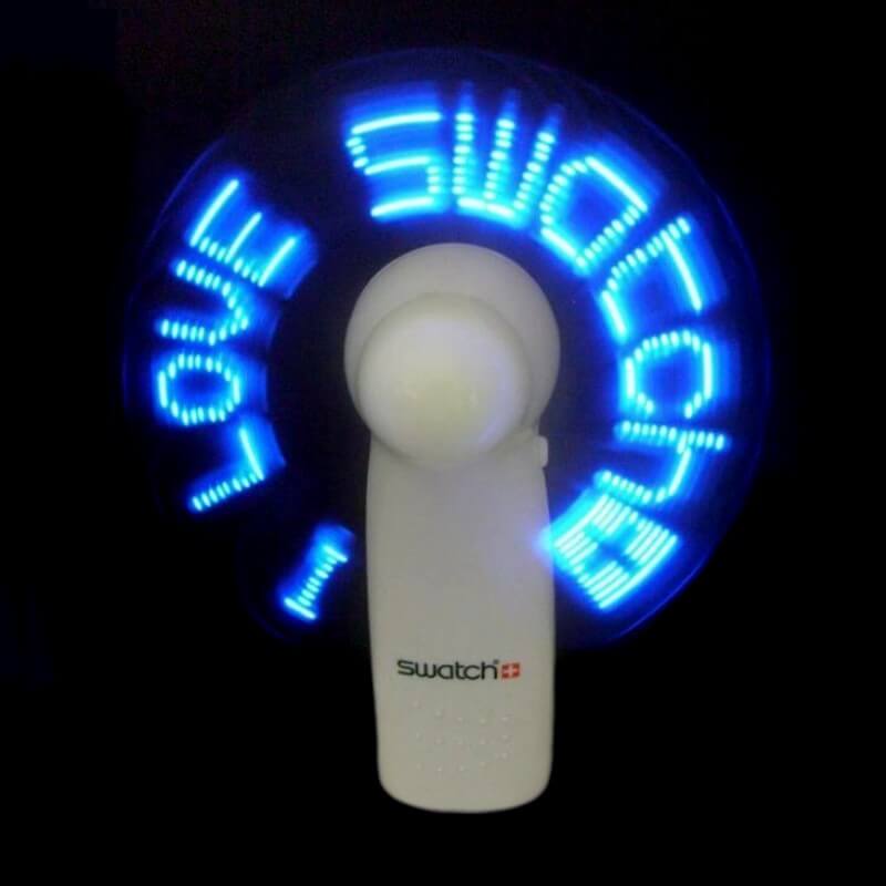 Přenosný LED větráček se svítícím textem či logem vhodný pro potisk. Vlastní text (případně jednoduché logo) Možnost potisku logem Dostupné barvy LED: modrá, červená, zelená, bílá ( vždy jedna).