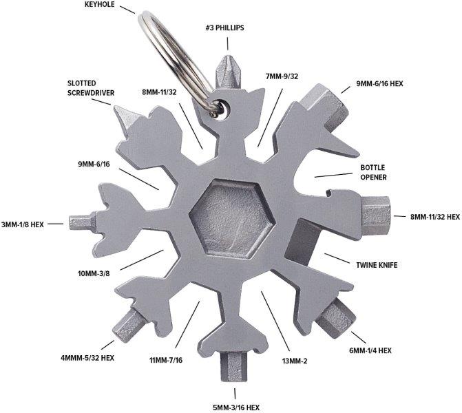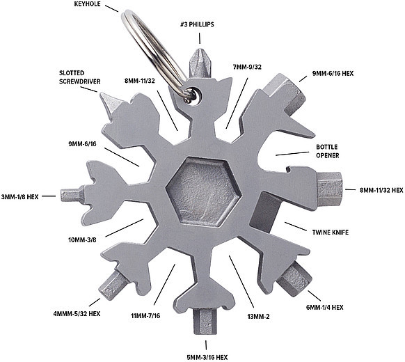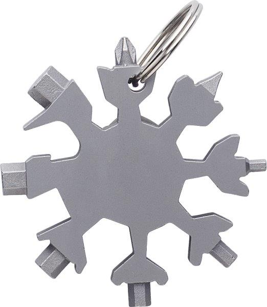 Přívěšek na klíče ve tvaru sněhové vločky. Multifunkční nářadí z nerezové oceli se 17 funkcemi (plochý šroubovák, otvírák na lahve, klíč, nůž na motouz a šestihranné klíče různých velikostí). Jednotlivě baleno v hnědé kartonové krabičce.
