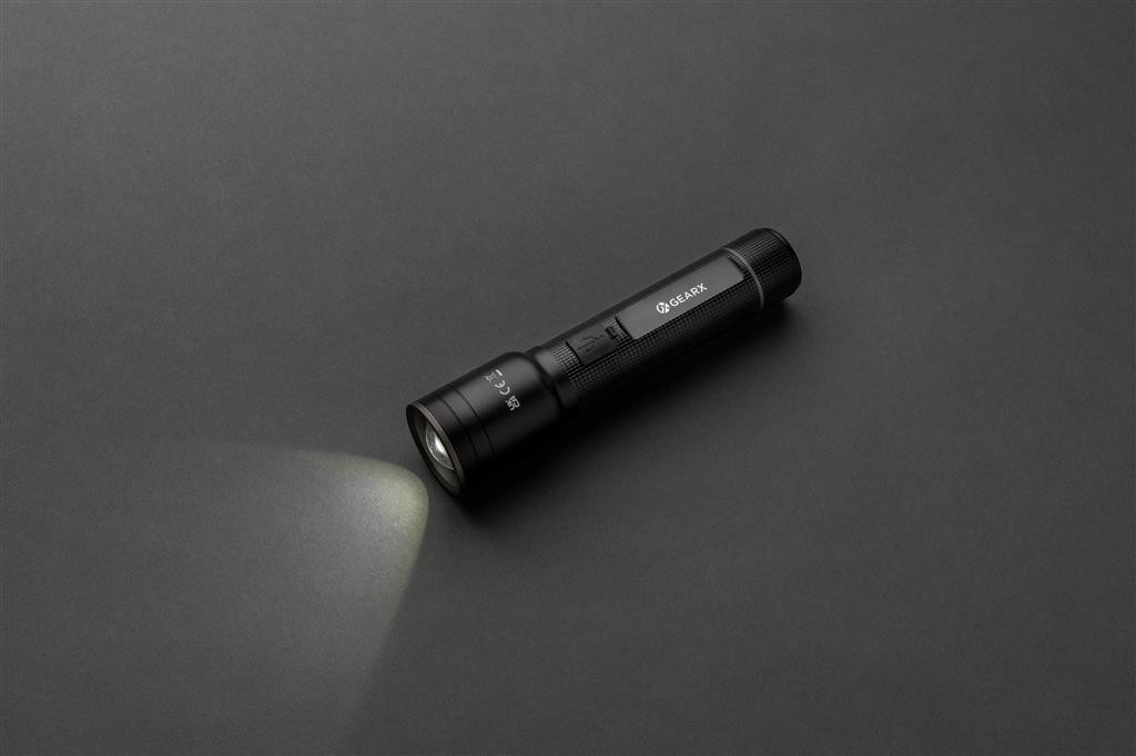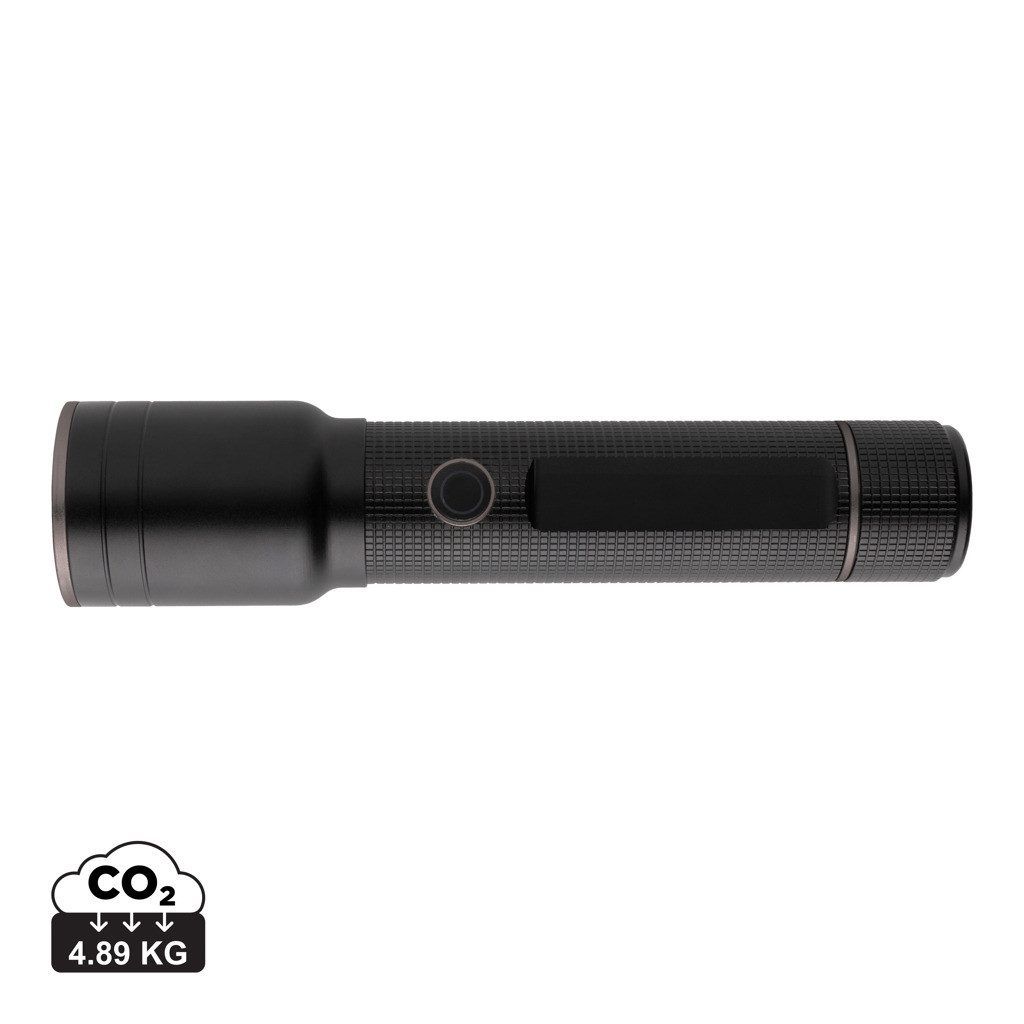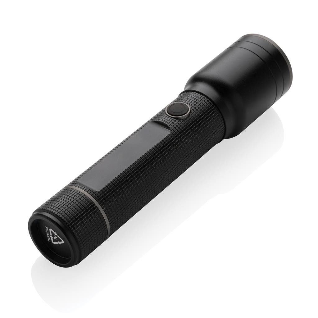 Vysoce funkční, výkonná a velmi stylová opakovaně dobíjitelná svítilna. Tělo vyrobené z prémiového RCS recyklovaného hliníku skvěle padne do ruky. RCS (Recycled Claim Standard) je globální standard, který umožňuje ověřit použití recyklovaného materiálu v produktu napříč celým dodavatelským řetězcem. Celkový podíl recyklátu dle váhy produktu: 20 %. Hliník při recyklaci nijak neztrácí své vlastnosti, lze jej tedy opakovaně recyklovat. Výkonná žárovka se svítivostí 1 500 lumenů a dosvitem až 800 m. 5 módů světla včetně SOS. IPX4 zabezpečuje odolnost vůči nepřízni počasí nebo vlhkosti. Integrovaná baterie s kapacitou 4 000 mAh umožňuje opakované dobíjení jednoduše skrze USB port a pužívání až 10h na jedno nabití. Skrze USB umožňuje i dobití telefonu. Produkt i balení bez PVC. Baleno v FSC dárkovém balení. Vstup USB C: 5V/1A, výstup: 5V/1A. 1 baterií typu Rechargeable v balení.