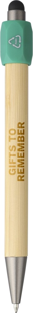 Bambusová propiska s funkcí otáčení spinneru z recyklovaného ABS plastu a černým stylusem na tlačítku. Má tlačítkový mechanismus, hrot o velikosti 1,0 mm a modrý inkoust. Součástí je logo z recyklovaného ABS plastu. Rozměry: 14,8 x 1,1 x 1,4 cm