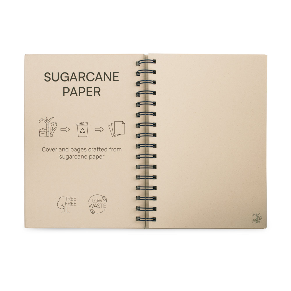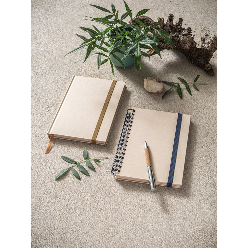 Zápisník A5 s kroužky, tvrdá vazba, vyrobený z papíru z cukrové třtiny (80% dužina z cukrové třtiny). Obsahuje 160 obyčejných stran v papíře z cukrové třtiny (80% dužina z cukrové třtiny) (90 g/m²) a gumičce na zavírání zápisníku. 147 x 214 mm