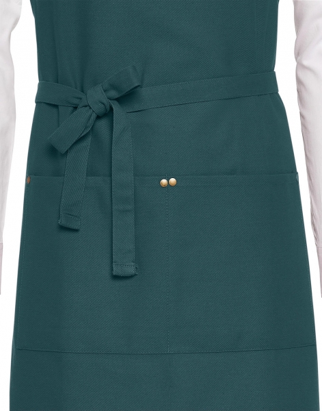 280 g/m² -100 % bavlna -měkké keprové plátno -módní zástěra v přírodním vzhledu -stálá barva -reaktivní barvení -nastavitelný nákrčník mTradiční uzel v kovovém očku v přední části náprsenky.kovové očko a nýty na kapse ze starožitně vypadající mosazi (odolné proti korozi) -pásky na zavazování ve výšce pasu -velká náprsní kapsa se 2 přihrádkami (40 x 20 cm) -krátká zástěra -velikosti: 90x75 cm -možnost praní na 60°C.