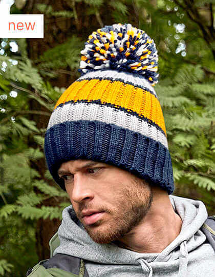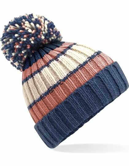 Podšívka ze 100% polyesterové ovčí kůže | 100% akryl Soft-Spun | Těžký žebrovaný úplet | Výrazné tříbarevné pruhované provedení | Luxusní bambulka nadměrné velikosti | Luxusní zateplená podšívka z ovčí kůže | Manžetový design | Odtrhávací cedulka