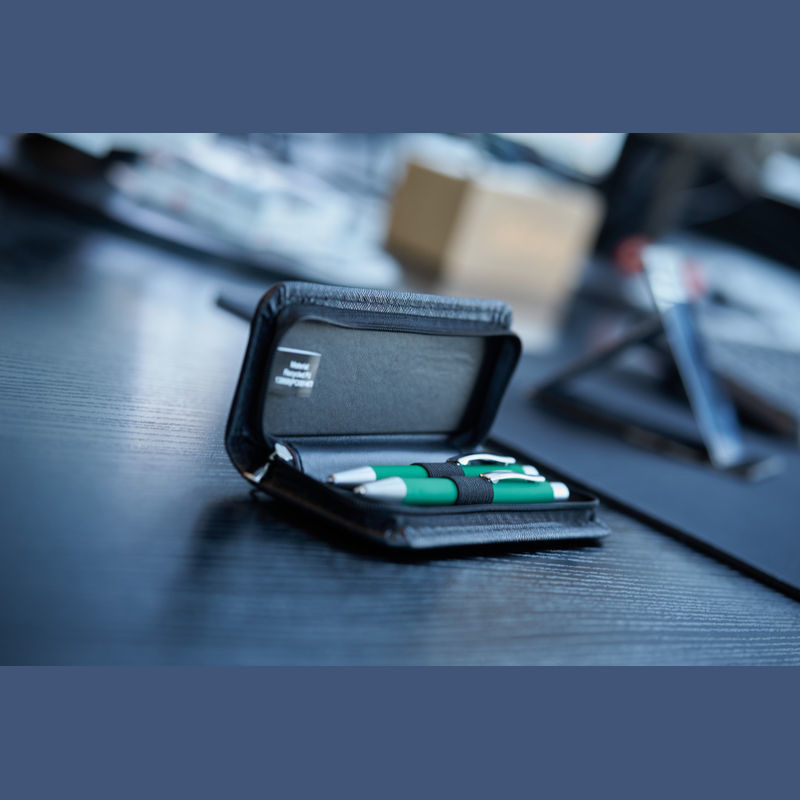 Sada s modře píšícím kuličkovým perem se stříbrnými aplikacemi a odpovídající mechanickou tužkou v elegantním PU pouzdře. Dokonalé pro stylové psaní . Upozornění: Pero a pentelka v sadě nemusí mít úplně stejný odstín barvy / může být výraznější bledší a tmavší/