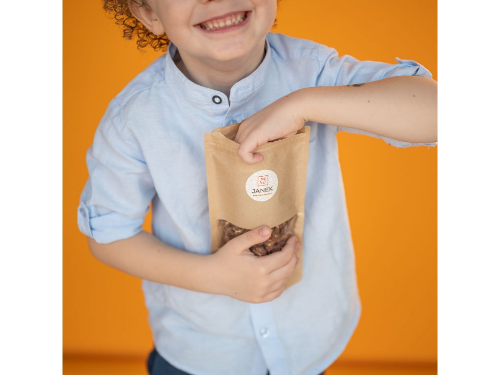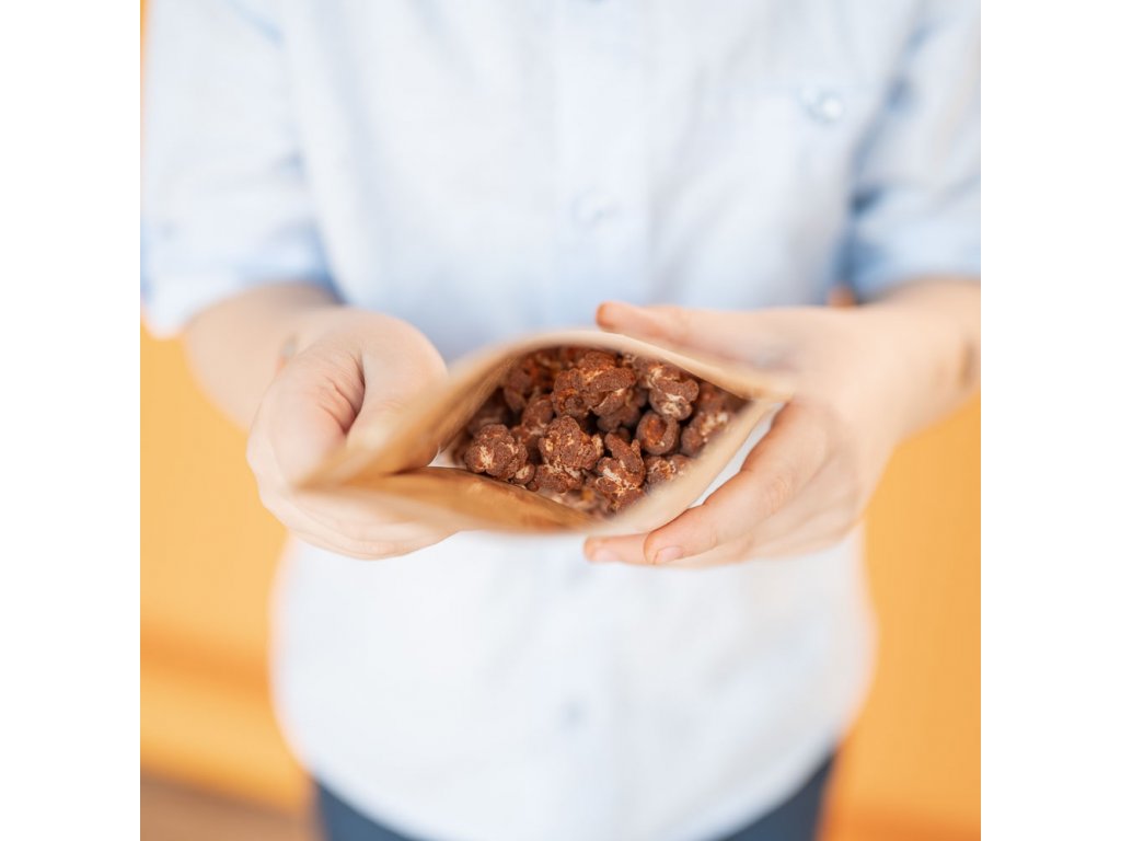 Čerstvě vypukané pukance obalené v bohaté vrstvě jemné mléčné čokolády. Bez aroma a barviv – jen poctivá chuť s pravou vanilkou. Sladce-slaná pochoutka, která potěší u filmu, jako malý dárek i jen tak pro radost. Složení: mléčná čokoláda (kakaová hmota 60%, kakaové máslo, sušené mléko, cukr, emulgátor: sójový lecitin, aroma: přírodní vanilka), kukuřice na pukance (40%). Hmotnost: 50 g. Minimální trvanlivost: 6 měsíců