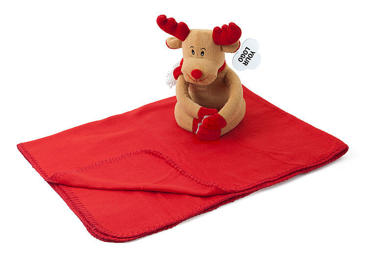Jemná červená fleecová deka složená v objetí plyšo- vého zvířátka s visačkou pro potisk. Ruce a nohy se zapínají na suchý zip. Rozměr deky 102 × 77 cm. Logo je možné buď výšivkou nebo na papírový štítek u plyšáka. Rozměr: 15 x 16,5 x 25 cm